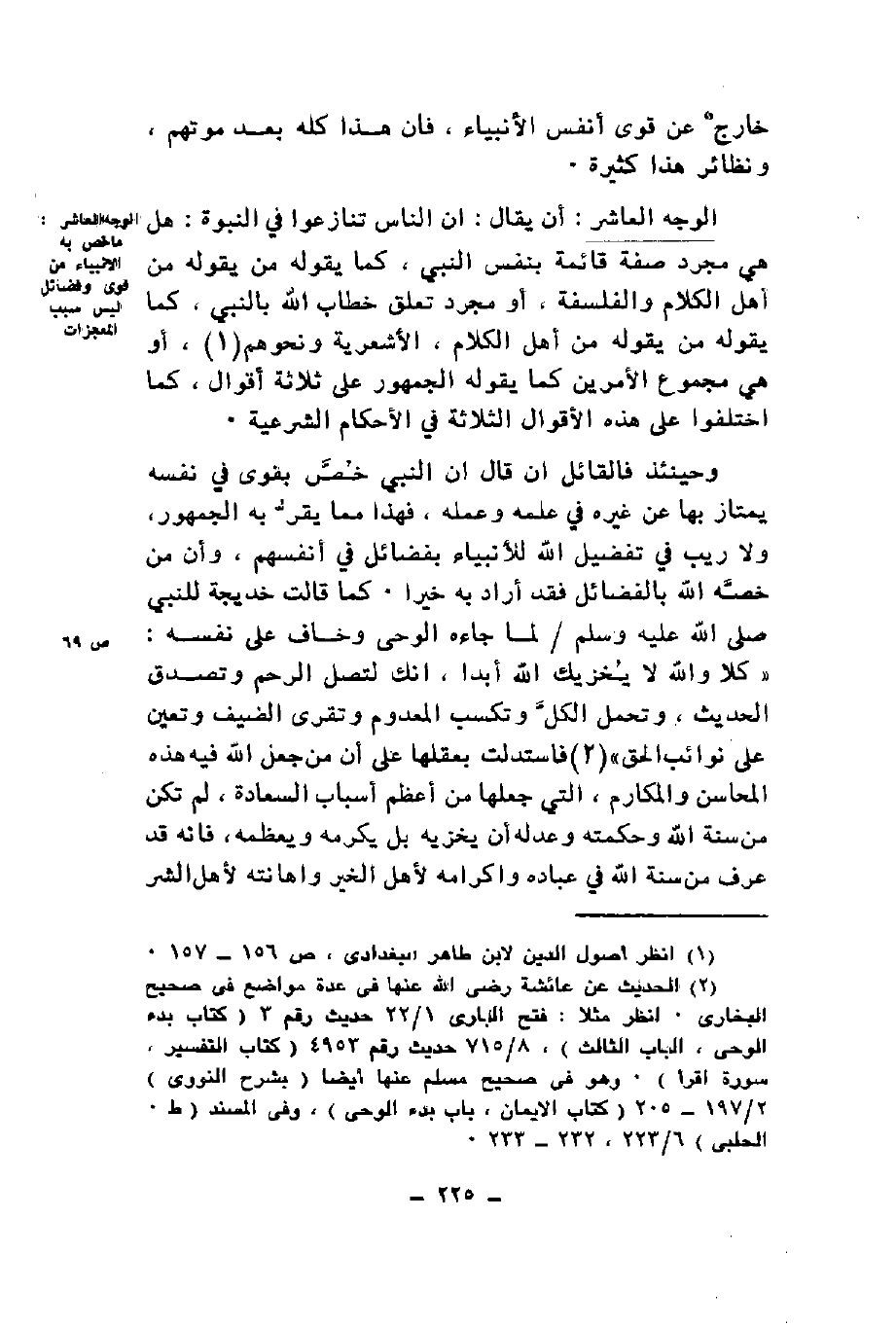 خارج عن قوى أنفس الأنبياء فإن هذا كله بعد موتهم ونظائر هذا كثيرة الوجه العاشر أن يقال إن الناس تنازعوا في النبوة هل هي مجرد صفة قائمة بنفس النبي كما يقوله من يقوله من أهل الكلام والفلسفة أو مجرد تعلق خطاب الله بالنبي كما يقوله من يقوله من أهل الكلام الأشعرية ونحوهم أو هي مجموع الأمرين كما يقوله الجمهور على ثلاثة أقوال كما اختلفوا على هذه الأقوال الثلاثة في الأحكام الشرعية وحينئذ فالقائل أن قال أن النبي خص بقوى في نفسه يمتاز بها عن غيره في علمه وعمله فهذا مما يقر به الجمهور ولا ريب في تفضيل الله للأنبياء بفضائل في أنفسهم وأن من خصه الله بالفضائل فقد أراد به خيرا كما قالت خديجة للنبي صَلَّى اللَّهُ عَلَيْهِ وَسَلَّمَ لما جاءه الوحي وخاف على نفسه: كلا والله لا يخزيك الله أبدا إنك لتصل الرحم وتصدق الحديث وتحمل الكل وتكسب المعدوم وتقرى الضيف وتعين على نوائب الحق فاستدلت بعقلها على أن من جعل الله فيه هذه المحاسن والمكارم التي جعلها من أعظم أسباب السعادة لم تكن من سنة الله وحكمته وعدله أن يخزيه بل يكرمه ويعظمه فإنه قد عرف من سنة الله في عباده وإكرامه لأهل الخير وإهانته لأهل الشر