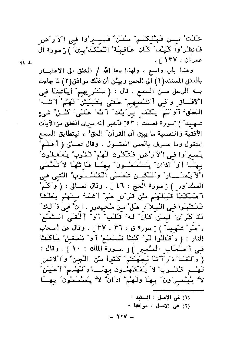 خَلَتْ مِنْ قَبْلِكُمْ سُنَنٌ فَسِيرُوا فِي الْأَرْضِ فَانْظُرُوا كَيْفَ كَانَ عَاقِبَةُ الْمُكَذِّبِينَ} وهذا باب واسع ولهذا دعا الله الخلق إلى الاعتبار بالعقل المستند إلى الحس وبين أن ذلك موافق لما جاءت به الرسل من السمع قال {سَنُرِيهِمْ آيَاتِنَا فِي الْآفَاقِ وَفِي أَنْفُسِهِمْ حَتَّى يَتَبَيَّنَ لَهُمْ أَنَّهُ الْحَقُّ أَوَلَمْ يَكْفِ بِرَبِّكَ أَنَّهُ عَلَى كُلِّ شَيْءٍ شَهِيدٌ} فأخبر أنه سيرى الخلق من الآيات الأفقية والنفسية ما يبين أن القرآن الحق فيتطابق السمع المنقول وما عرف بالحس المعقول وقال تعالى {أَفَلَمْ يَسِيرُوا فِي الْأَرْضِ فَتَكُونَ لَهُمْ قُلُوبٌ يَعْقِلُونَ بِهَا أَوْ آذَانٌ يَسْمَعُونَ بِهَا فَإِنَّهَا لا تَعْمَى الْأَبْصَارُ وَلَكِنْ تَعْمَى الْقُلُوبُ الَّتِي فِي الصُّدُورِ} وقال تعالى {وَكَمْ أَهْلَكْنَا قَبْلَهُمْ مِنْ قَرْنٍ هُمْ أَشَدُّ مِنْهُمْ بَطْشاً فَنَقَّبُوا فِي الْبِلادِ هَلْ مِنْ مَحِيصٍ إِنَّ فِي ذَلِكَ لَذِكْرَى لِمَنْ كَانَ لَهُ قَلْبٌ أَوْ أَلْقَى السَّمْعَ وَهُوَ شَهِيدٌ} وقال عن أصحاب النار {ووَقَالُوا لَوْ كُنَّا نَسْمَعُ أَوْ نَعْقِلُ مَا كُنَّا فِي أَصْحَابِ السَّعِيرِ} وقال {وَلَقَدْ ذَرَأْنَا لِجَهَنَّمَ كَثِيراً مِنَ الْجِنِّ وَالْأِنْسِ لَهُمْ قُلُوبٌ لا يَفْقَهُونَ بِهَا وَلَهُمْ أَعْيُنٌ لا يُبْصِرُونَ بِهَا وَلَهُمْ آذَانٌ لا يَسْمَعُونَ بِهَا