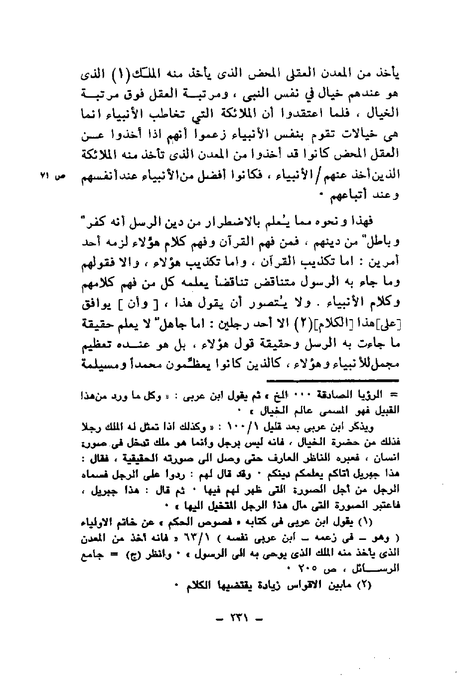 يأخذ من المعدن العقلي المحض الذي يأخذ منه الملك الذي هو عندهم خيال في نفس النبي ومرتبة العقل فوق مرتبة الخيال فلما اعتقدوا أن الملائكة التي تخاطب الأنبياء إنما هي خيالات تقوم بنفس الأنبياء زعموا أنهم إذا اخذوا عن العقل المحض كانوا قد أخذوا من المعدن الذي تأخذ منه الملائكة الذين أخذ عنهم الأنبياء فكانوا أفضل من الأنبياء عند أنفسهم وعند أتباعهم فهذا ونحوه مما يعلم بالاضطرار من دين الرسل أنه كفر وباطل من دينهم فمن فهم القرآن وفهم كلام هؤلاء لزمه أحد أمرين إما تكذيب القرآن وإما تكذيب هؤلاء وإلا فقولهم وما جاء به الرسول متناقض تناقضا يعلمه كل من فهم كلامهم وكلام الأنبياء ولا يتصور أن يقول هذا وأن يوافق على هذا الكلام إلا أحد رجلين إما جاهل لا يعلم حقيقة ما جاءت به الرسل وحقيقة قول هؤلاء بل هو عنده تعظيم مجمل للأنبياء وهؤلاء كالذين كانوا يعظمون محمدا ومسيلمة