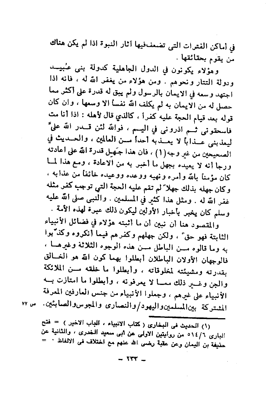 في أماكن الفترات التي تضعف فيها آثار النبوة إذا لم يكن هناك من يقوم بحقائقها وهؤلاء يكونون في الدول الجاهلية كدولة بني عبيد ودولة التتار ونحوهم ومن هؤلاء من يغفر الله له فإنه إذا اجتهد وسعه في الإيمان بالرسول ولم يبق له قدرة على أكثر مما حصل له من الإيمان به لم يكلف الله نفسا إلا وسعها وإن كان قوله بعد قيام الحجة عليه كفرا كالذي قال لأهله إذا انا مت فاسحقوني ثم اذروني في اليم فوالله لئن قدر الله علي ليعذبني عذابا لا يعذبه أحدا من العالمين والحديث في الصحيحين من غير وجه فإن هذا جهل قدرة الله على إعادته ورجا أنه لا يعيده بجهل ما أخبر به من الإعادة ومع هذا لما كان مؤمنا بالله وأمره ونهيه ووعده ووعيده خائفا من عذابه وكان جهله بذلك جهلا لم تقم عليه الحجة التي توجب كفر مثله غفر الله له ومثل هذا كثير في المسلمين والنبي صَلَّى اللَّهُ عَلَيْهِ وَسَلَّمَ كان يخبر بأخبار الأولين ليكون ذلك عبرة لهذه الأمة والمقصود هنا أن نبين أن ما أثبته هؤلاء في فضائل الأنبياء الثابتة فهو حق ولكن جهلهم وكفرهم فيما أنكروه وكذبوا به وما قالوه من الباطل من هذه الوجوه الثلاثة وغيرها فالوجهان الأولان الباطلان أبطلوا بهما كون الله هو الخالق بقدرته ومشيئته لمخلوقاته وأبطلوا ما خلقه من الملائكة والجن وغير ذلك مما لا يعرفونه وأبطلوا ما امتازت به الأنبياء على غيرهم وجعلوا الأنبياء من جنس العارفين المعرفة المشتركة بين المسلمين واليهود والنصارى والمجوس والصابئين