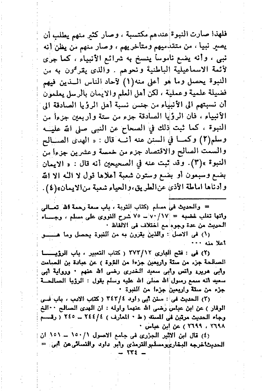 فلهذا صارت النبوة عندهم مكتسبة وصار كثير منهم يطلب أن يصير نبيا من متقدميهم ومتأخريهم وصار منهم من يظن أنه نبي وأنه يضع ناموسا ينسخ به شرائع الأنبياء كما جرى لأئمة الإسماعيلية الباطنية ونحوهم والذي يقرون به من النبوة يحصل وما هو أعلى منه لآحاد الناس الذين فيهم فضيلة علمية وعملية لكن أهل العلم والإيمان بالرسل يعلمون أن نسبتهم إلى الأنبياء من جنس نسبة أهل الرؤيا الصادقة إلى الأنبياء فإن الرؤيا الصادقة جزء من ستة وأربعين جزءا من النبوة كما ثبت ذلك في الصحاح عن النبي صَلَّى اللَّهُ عَلَيْهِ وَسَلَّمَ وكما في السنن عنه أنه قال: "الهدى الصالح والسمت الصالح والاقتصاد جزء من خمسة وعشرين جزءا من النبوة" وقد ثبت عنه في الصحيحين أنه قال: "الإيمان بضع وسبعون أو بضع وستون شعبة أعلاها قول لا إله إلا الله وأدناها إماطة الأذى عن الطريق والحياء شعبة من الإيمان"