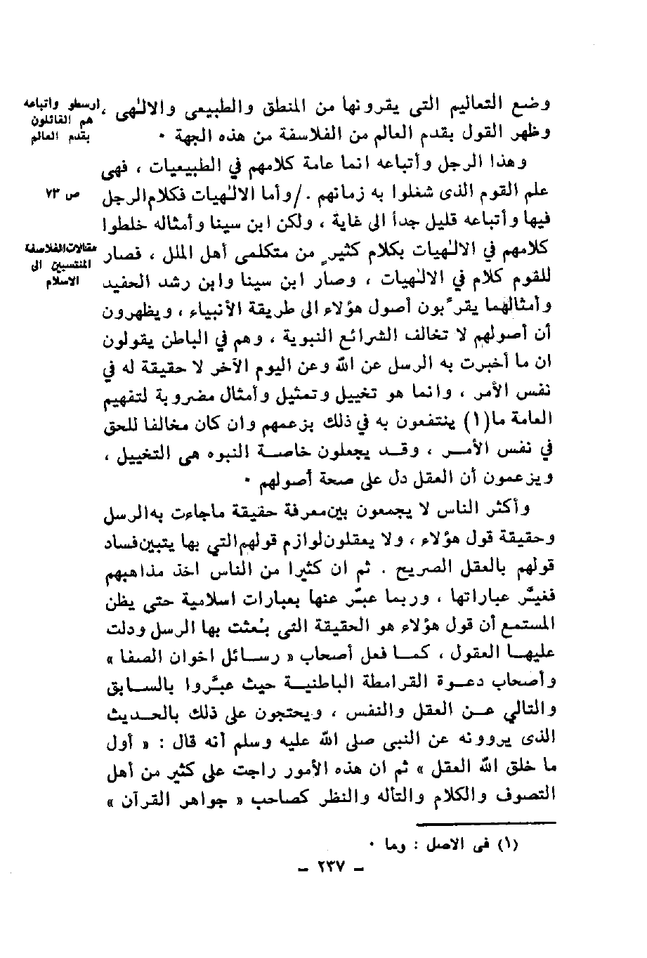 وهذا الرجل وأتباعه إنما عامة كلامهم في الطبيعيات فهي علم القوم الذي شغلوا به زمانهم وأما الإلهيات فكلام الرجل فيها وأتباعه قليل جدا إلى غاية ولكن ابن سينا وأمثاله خلطوا كلامهم في الإلهيات بكلام كثير من متكلمي أهل الملل فصار للقوم كلام في الإلهيات بكلام كثير من متكلمي أهل الملل فصار للقوم كلام في الإلهيات وصار ابن سينا وابن رشد الحفيد وأمثالهما يقربون أصول هؤلاء إلى طريقة الأنبياء ويظهرون أن أصولهم لا تخالف الشرائع النبوية وهم في الباطن يقولون أن ما أخبرت به الرسل عن الله وعن اليوم الآخر لا حقيقة له في نفس الأمر وإنما هو تخييل وتمثيل وأمثال مضروبة لتفهيم العامة ما ينتفعون به في ذلك بزعمهم وإن كان مخالفا للحق في نفس الأمر وقد يجعلون خاصة النبوه هي التخييل ويزعمون أن العقل دل على صحة أصولهم وأكثر الناس لا يجمعون بين معرفة حقيقة ما جاءت به الرسل وحقيقة قول هؤلاء ولا يعقلون لوازم قولهم التي بها يتبين فساد قولهم بالعقل الصريح ثم إن كثيرا من الناس آخذ مذاهبهم فغير عباراتها وربما عبر عنها بعبارات إسلامية حتى يظن المستمع أن قول هؤلاء هو الحقيقة التي بعثت بها الرسل ودلت عليها العقول كما فعل أصحاب رسائل إخوان الصفا وأصحاب دعوة القرامطة الباطنية حيث عبروا بالسابق والتالي عن العقل والنفس ويحتجون على ذلك بالحديث الذي يروونه عن النبي صَلَّى اللَّهُ عَلَيْهِ وَسَلَّمَ أنه قال: "أول ما خلق الله العقل" ثم إن هذه الأمور راجت على كثير من أهل التصوف والكلام والتأله والنظر كصاحب جواهر القرآن