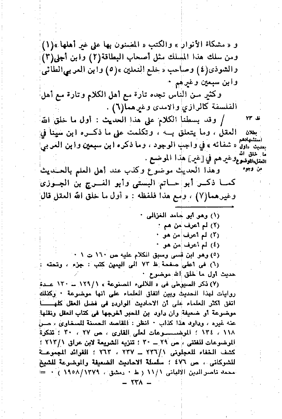 ومشكاة الأنوار والكتب المضنون بها على غير أهلها ومن سلك هذا المسلك مثل أصحاب البطاقة وابن أجلى والشوذي وصاحب خلع النعلين وابن العربي الطائي وابن سبعين وغيرهم وكثير من الناس تجده تارة مع أهل الكلام وتارة مع أهل الفلسفة كالرازي والآمدي وغيرهما وقد بسطنا الكلام على هذا الحديث أول ما خلق الله العقل وما يتعلق به وتكلمت على ما ذكره ابن سينا في شفائه في واجب الوجود وما ذكره ابن سبعين وابن العربي وغيرهم في غير هذا الموضع وهذا الحديث موضوع وكذب عند أهل العلم بالحديث كما ذكر أبو حاتم البستي وأبو الفرج بن الجوزي وغيرهما ومع هذا فلفظه أول ما خلق الله العقل قال