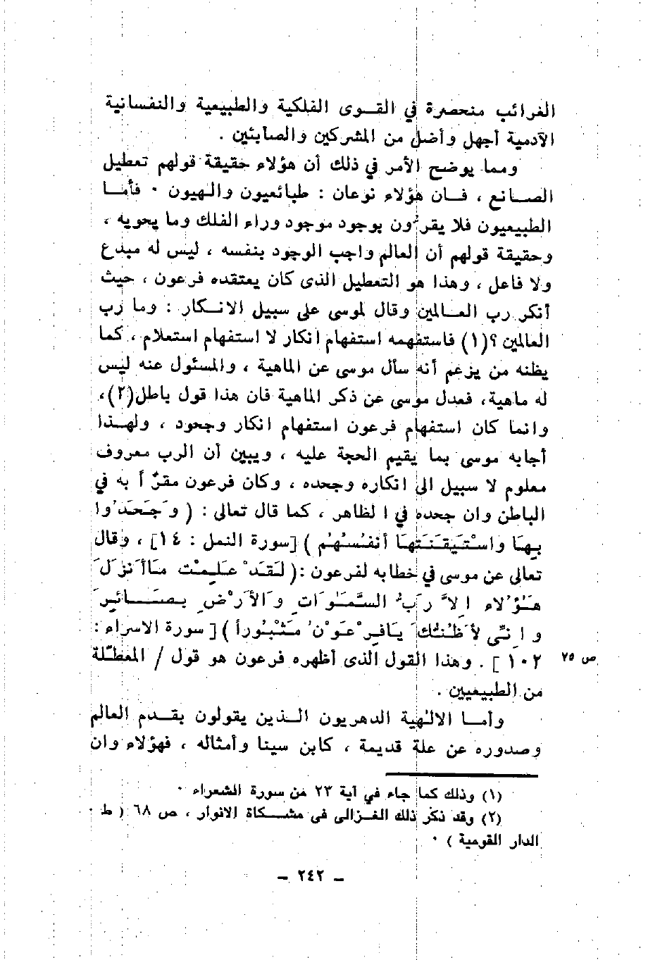 الغرائب منحصرة في القوى الفلكية والطبيعية والنفسانية الآدمية أجهل وأضل من المشركين والصابئين ومما يوضح الأمر في ذلك أن هؤلاء حقيقة قولهم تعطيل الصانع فإن هؤلاء نوعان طبائعيون والهيون فأما الطبيعيون فلا يقرون بوجود موجود وراء الفلك وما يحويه وحقيقة قولهم أن العالم واجب الوجود بنفسه ليس له مبدع ولا فاعل وهذا هو التعطيل الذي كان يعتقده فرعون حيث أنكر رب العالمين وقال لموسى على سبيل الإنكار وما رب العالمين فاستفهمه استفهام إنكار لا استفهام استعلام كما يظنه من يزعم أنه سأل موسى عن الماهية والمسئول عنه ليس له ماهية فعدل موسى عن ذكر الماهية فإن هذا قول باطل وإنما كان استفهام فرعون استفهام إنكار وجحود ولهذا أجابه موسى بما يقيم الحجة عليه ويبين أن الرب معروف معلوم لا سبيل إلى إنكاره وجحده وكان فرعون مقرا به في الباطن وإن جحده في الظاهر كما قال تعالى {وَجَحَدُوا بِهَا وَاسْتَيْقَنَتْهَا أَنْفُسُهُمْ} وقال تعالى عن موسى في خطابه لفرعون {قَالَ لَقَدْ عَلِمْتَ مَا أَنْزَلَ هَؤُلاءِ إِلَّا رَبُّ السَّمَاوَاتِ وَالْأَرْضِ بَصَائِرَ وَإِنِّي لَأَظُنُّكَ يَا فِرْعَوْنُ مَثْبُوراً} وهذا القول الذي أظهره فرعون هو قول المعطلة من الطبيعين وأما الإلهية الدهريون الذين يقولون بقدم العالم وصدوره عن علة قديمة كابن سينا وأمثاله فهؤلاء وإن