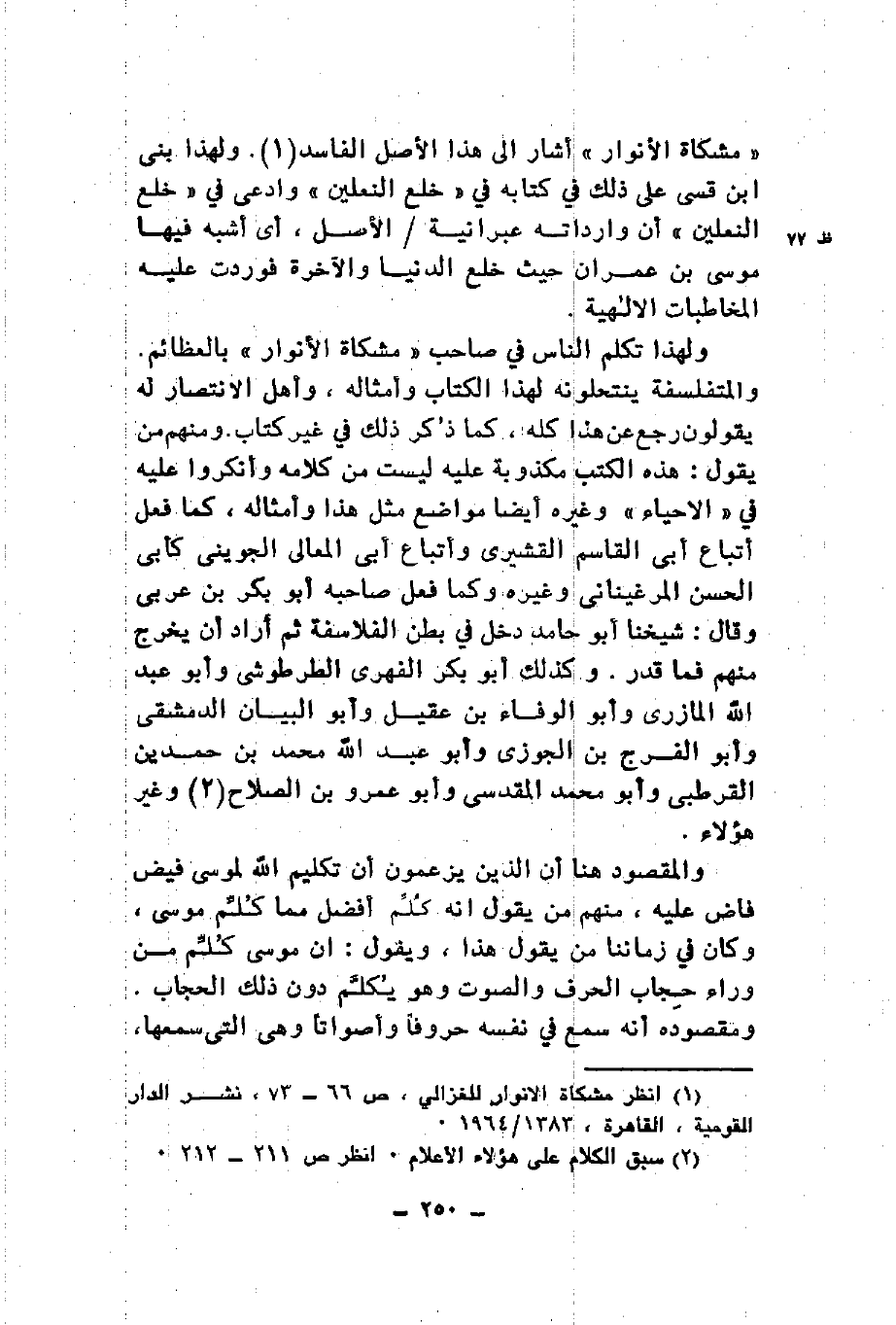 مشكاة الأنوار أشار إلى هذا الأصل الفاسد ولهذا بنى ابن قسي على ذلك في كتابه في خلع النعلين وادعى في خلع النعلين أن وارداته عبرانية الأصل أي أشبه فيها موسى بن عمران حيث خلع الدنيا والآخرة فوردت عليه المخاطبات الإلهية ولهذا تكلم الناس في صاحب مشكاة الأنوار بالعظائم والمتفلسفة ينتحلونه لهذا الكتاب وأمثاله وأهل الانتصار له يقولون رجع عن هذا كله كما ذكر ذلك في غير كتاب ومنهم من يقول هذه الكتب مكذوبة عليه ليست من كلامه وأنكروا عليه في الأحياء وغيره أيضا مواضع مثل هذا وأمثاله كما فعل أتباع أبي القاسم القشيري وأتباع أبي المعالي الجويني كأبي الحسن المرغيناني وغيره وكما فعل صاحبه أبو بكر بن عربي وقال شيخنا أبو حامد دخل في بطن الفلاسفة ثم أراد أن يخرج منهم فما قدر وكذلك أبو بكر الفهري الطرطوشي وأبو عبد الله المازري وأبو الوفاء بن عقيل وأبو البيان الدمشقي وأبو الفرج بن الجوزي وأبو عبد الله محمد بن حمدين القرطبي وأبو محمد المقدسي وأبو عمرو بن الصلاح وغير هؤلاء والمقصود هنا أن الذين يزعمون أن تكليم الله لموسى فيض فاض عليه منهم من يقول أنه كلم أفضل مما كلم موسى وكان في زماننا من يقول هذا ويقول أن موسى كلم من وراء حجاب الحرف والصوت وهو يكلم دون ذلك الحجاب ومقصوده أنه سمع في نفسه حروفا وأصواتا وهي التي سمعها
