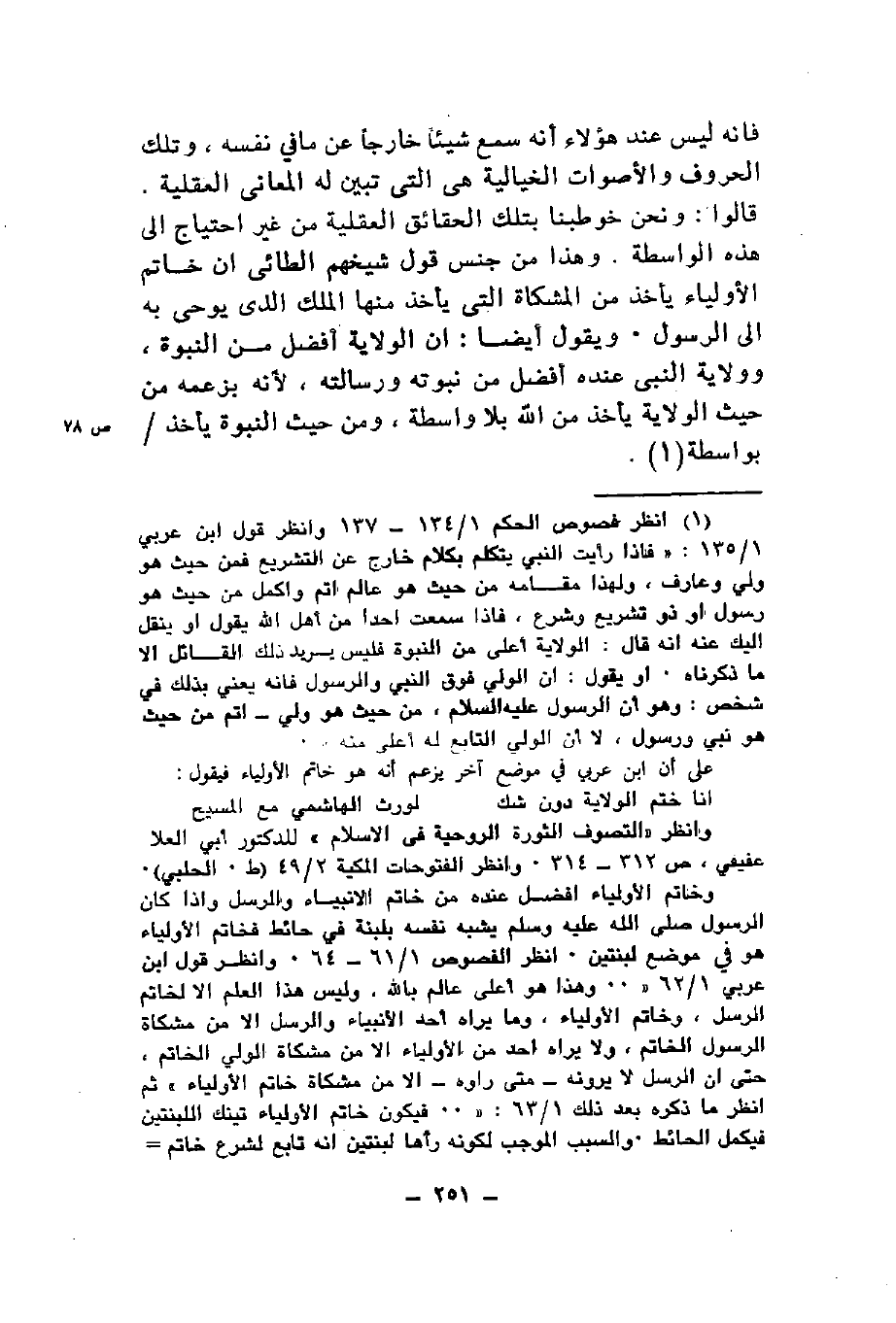 فإنه ليس عند هؤلاء أنه سمع شيئا خارجا عن ما في نفسه وتلك الحروف والأصوات الخيالية هي التي تبين له المعاني العقلية قالوا ونحن خوطبنا بتلك الحقائق العقلية من غير احتياج إلى هذه الواسطة وهذا من جنس قول شيخهم الطائي أن خاتم الأولياء يأخذ من المشكاة التي يأخذ منها الملك الذي يوحى به إلى الرسول ويقول أيضا أن الولاية أفضل من النبوة وولاية النبي عنده أفضل من نبوته ورسالته لأنه بزعمه من حيث الولاية يأخذ من الله بلا واسطة ومن حيث النبوة يأخذ بواسطة