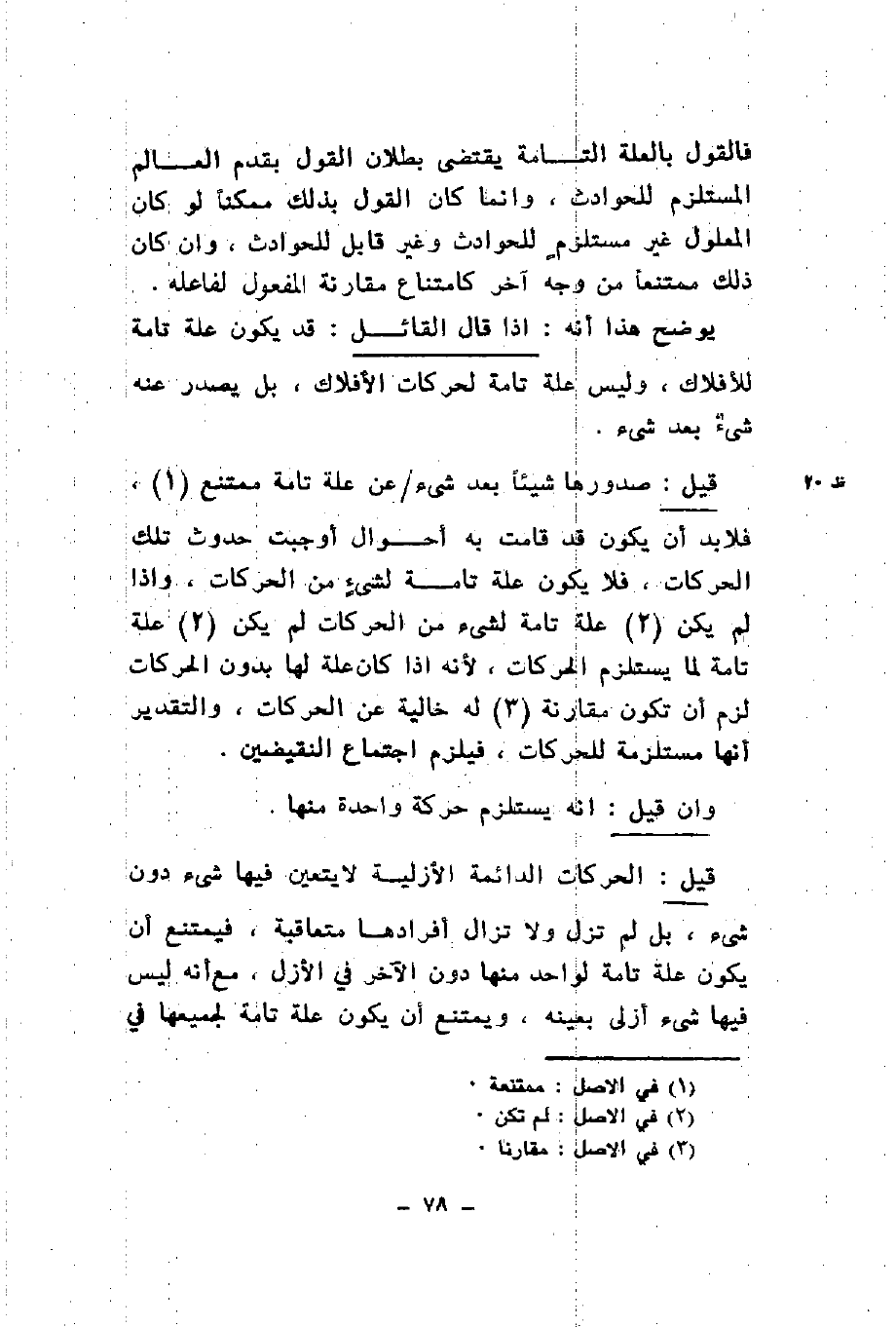 قيل صدورها شيئا بعد شيء عن علة تامة ممتنع فلا بد أن يكون قد قامت به أحوال اوجبت حدوث تلك الحركات فلا يكون علة تامة لشيء من الحركات وإذا لم يكن علة تامة لشيء من الحركات لم يكن علة تامة لما يستلزم الحركات لأنه إذا كان علة لها بدون الحركات لزم أن تكون مقارنة له خالية عن الحركات والتقدير أنها مستلزمة للحركات فيلزم اجتماع النقيضين وإن قيل انه يستلزم حركة واحدة منها قيل الحركات الدائمة الأزلية لا يتعين فيها شيء دون شيء بل لم تزل ولا تزال أفرادها متعاقبة فيمتنع أن يكون علة تامة لواحد منها دون الآخر في الأزل مع أنه ليس فيها شيء أزلي بعينه ويمتنع أن يكون علة تامة لجميعها في
