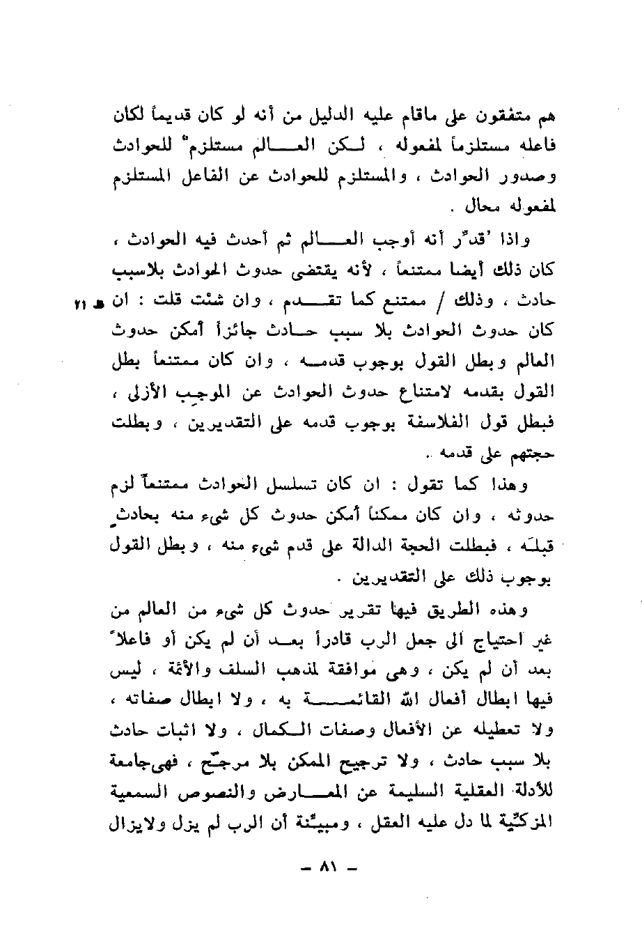 هم متفقون على ما قام عليه الدليل من أنه لو كان قديما لكان فاعله مستلزما لمفعوله لكن العالم مستلزم للحوادث وصدور الحوادث والمستلزم للحوادث عن الفاعل المستلزم لمفعوله محال وإذا قدر أنه اوجب العالم ثم أحدث فيه الحوادث كان ذلك أيضا ممتنعا لأنه يقتضي حدوث الحوادث بلا سبب حادث وذلك ممتنع كما تقدم وإن شئت قلت إن كان حدوث الحوادث بلا سبب حادث جائزا أمكن حدوث العالم وبطل القول بوجوب قدمه وإن كان ممتنعا بطل القول بقدمه لامتناع حدوث الحوادث عن الموجب الأزلي فبطل قول الفلاسفة بوجوب قدمه على التقديرين وبطلت حجتهم على قدمه وهذا كما تقول إن كان تسلسل الحوادث ممتنعا لزم حدوثه وإن كان ممكنا أمكن حدوث كل شيء منه بحادث قبله فبطلت الحجة الدالة على قدم شيء منه وبطل القول بوجوب ذلك على التقديرين وهذه الطريق فيها تقرير حدوث كل شيء من العالم من غير احتياج إلى جعل الرب قادرا بعد أن لم يكن أو فاعلا بعد أن لم يكن وهي موافقة لمذهب السلف والأئمة ليس فيها ابطال أفعال الله القائمة به ولا ابطال صفاته ولا تعطيله عن الأفعال وصفات الكمال ولا إثبات حادث بلا سبب حادث ولا ترجيح الممكن بلا مرجح فهي جامعة للأدلة العقلية السليمة عن المعارض والنصوص السمعية المزكية لما دل عليه العقل ومبينة أن الرب لم يزل ولا يزال