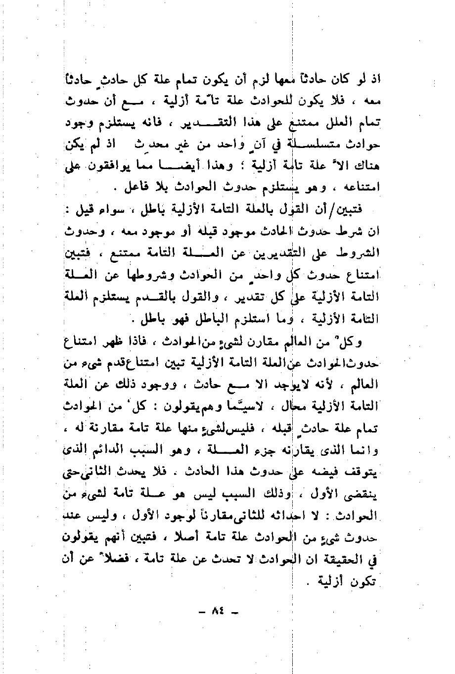 وكل من العالم مقارن لشيء من الحوادث فإذا ظهر امتناع حدوث الحوادث عن العلة التامة الأزلية تبين امتناع قدم شيء من العالم لأنه لا يوجد إلا مع حادث ووجود ذلك عن العلة التامة الأزلية محال لا سيما وهم يقولون كل من الحوادث تمام علة حادث قبله فليس لشيء منها علة تامة مقارنة له وإنما الذي يقارنه جزء العلة وهو السبب الدائم الذي يتوقف فيضه على حدوث هذا الحادث فلا يحدث الثاني حتى ينقضي الأول وذلك السبب ليس هو علة تامة لشيء من الحوادث لا احداثه للثاني مقارنا لوجود الأول وليس عند حدوث شيء من الحوادث علة تامة أصلا فتبين أنهم يقولون في الحقيقة أن الحوادث لا تحدث عن علة تامة فضلا عن أن تكون أزلية