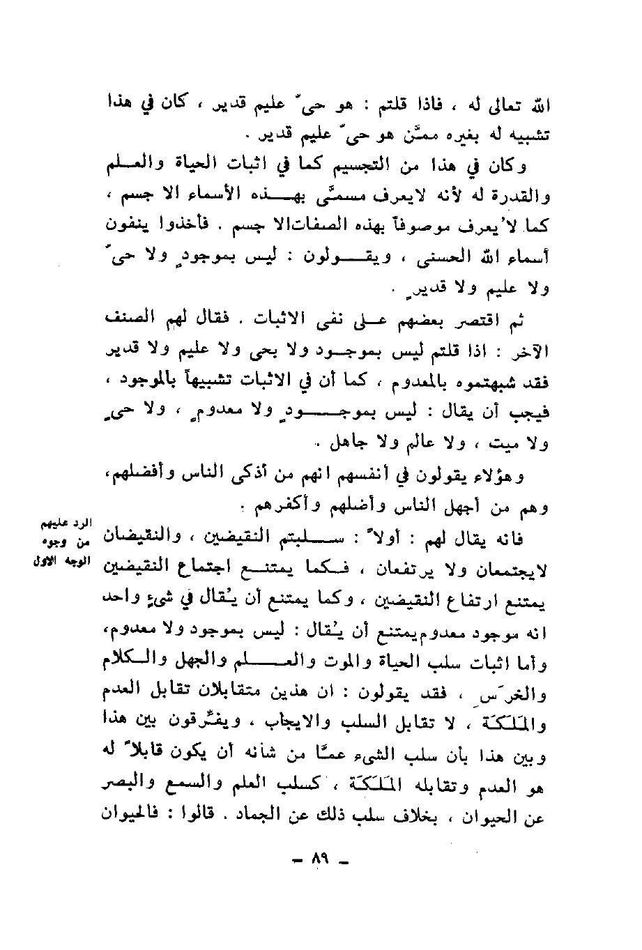 الله تعالى له فإذا قلتم هو حي عليم قدير كان في هذا تشبيه له بغيره ممن هو حي عليم قدير وكان في هذا من التجسيم كما في إثبات الحياة والعلم والقدرة له لأنه لا يعرف مسمى بهذه الأسماء إلا جسم كما لا يعرف موصوفا بهذه الصفات إلا جسم فأخذوا ينفون أسماء الله الحسنى ويقولون ليس بموجود ولا حي ولا عليم ولا قدير ثم اقتصر بعضهم على نفي الإثبات فقال لهم الصنف الآخر إذا قلتم ليس بموجود ولا بحي ولا عليم ولا قدير فقد شبهتموه بالمعدوم كما أن في الإثبات تشبيها بالموجود فيجب أن يقال ليس بموجود ولا معدوم ولا حي ولا ميت ولا عالم ولا جاهل وهؤلاء يقولون في أنفسهم أنهم من أذكى الناس وأفضلهم وهم من أجهل الناس وأضلهم وأكفرهم فإنه يقال لهم أولا سلبتم النقيضين والنقيضان لا يجتمعان ولا يرتفعان فكما يمتنع اجتماع النقيضين يمتنع ارتفاع النقيضين وكما يمتنع أن يقال في شيء واحد أنه موجود معدوم يمتنع أن يقال ليس بموجود ولا معدوم وأما إثبات سلب الحياة والموت والعلم والجهل والكلام والخرس فقد يقولون أن هذين متقابلان تقابل العدم والملكة لا تقابل السلب والإيجاب ويفرقون بين هذا وبين هذا بأن سلب الشيء عما من شأنه أن يكون قابلا له هو العدم وتقابله الملكة كسلب العلم والسمع والبصر عن الحيوان بخلاف سلب ذلك عن الجماد قالوا فالحيوان