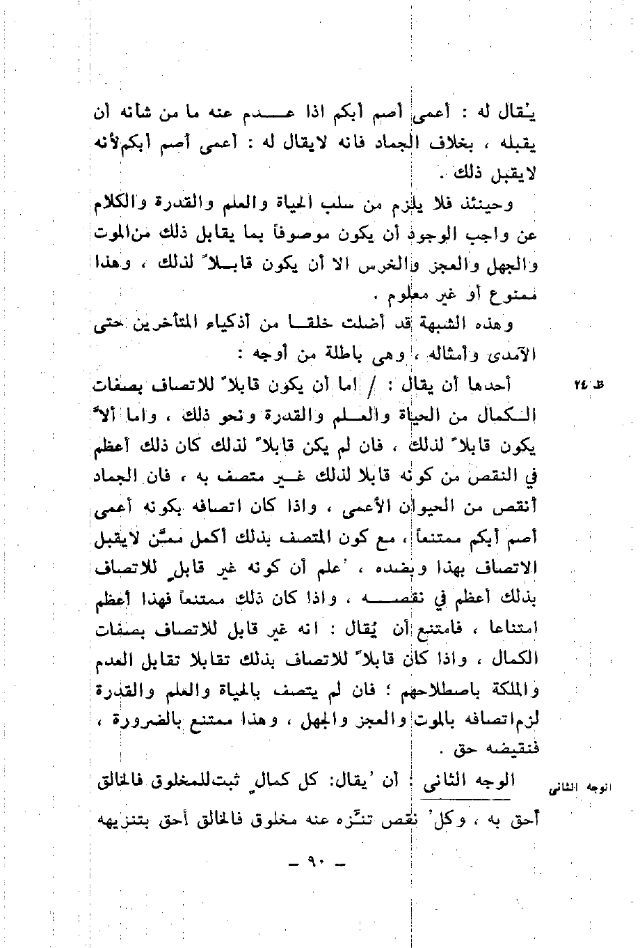 يقال له أعمى أصم أبكم إذا عدم عنه ما من شأنه أن يقبله بخلاف الجماد فإنه لا يقال له أعمى أصم أبكم لأنه لا يقبل ذلك وحينئذ فلا يلزم من سلب الحياة والعلم والقدرة والكلام عن واجب الوجود أن يكون موصوفا بما يقابل ذلك من الموت والجهل والعجز والخرس إلا أن يكون قابلا لذلك وهذا ممنوع أو غير معلوم وهذه الشبهة قد أضلت خلقا من أذكياء المتأخرين حتى الآمدي وأمثاله وهي باطلة من أوجه: أحدها أن يقال إما أن يكون قابلا للاتصاف بصفات الكمال من الحياة والعلم والقدرة ونحو ذلك وإما ألا يكون قابلا لذلك فإن لم يكن قابلا لذلك كان ذلك أعظم في النقص من كونه قابلا لذلك غير متصف به فإن الجماد أنقص من الحيوان الأعمى وإذا كان اتصافه بكونه أعمى أصم أبكم ممتنعا مع كون المتصف بذلك أكمل ممن لا يقبل الاتصاف بهذا وبضده علم أن كونه غير قابل للاتصاف بذلك أعظم في نقصه وإذا كان ذلك ممتنعا فهذا أعظم امتناعا فامتنع أن يقال أنه غير قابل للاتصاف بصفات الكمال وإذا كان قابلا للاتصاف بذلك تقابلا تقابل العدم والملكة باصطلاحهم فإن لم يتصف بالحياة والعلم والقدرة لزم اتصافه بالموت والعجز والجهل وهذا ممتنع بالضرورة فنقيضه حق