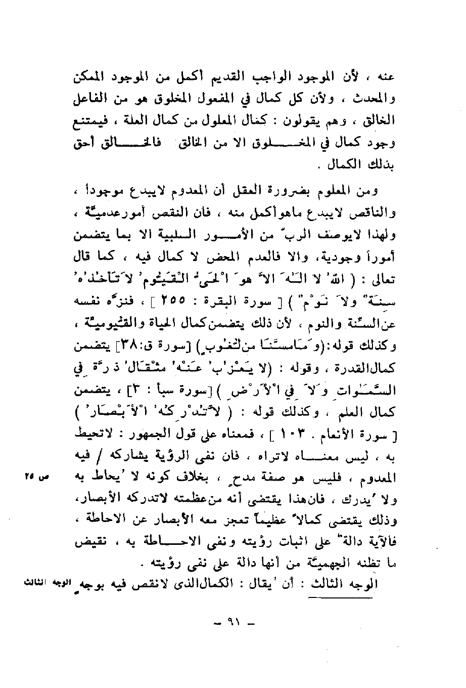 عنه لأن الموجود الواجب القديم أكمل من الموجود الممكن والمحدث ولأن كل كمال في المفعول المخلوق هو من الفاعل الخالق وهم يقولون كمال المعلول من كمال العلة فيمتنع وجود كمال في المخلوق إلا من الخالق فالخالق أحق بذلك الكمال ومن المعلوم بضرورة العقل أن المعدوم لا يبدع موجودا والناقص لا يبدع ما هو أكمل منه فإن النقص أمور عدمية ولهذا لا يوصف الرب من الأمور السلبية إلا بما يتضمن أمورا وجودية وإلا فالعدم المحض لا كمال فيه كما قال تعالى {اللَّهُ لا إِلَهَ إِلَّا هُوَ الْحَيُّ الْقَيُّومُ لا تَأْخُذُهُ سِنَةٌ وَلا نَوْمٌ} فنزه نفسه عن السنة والنوم لأن ذلك يتضمن كمال الحياة والقيومية وكذلك قوله {وَمَا مَسَّنَا مِنْ لُغُوبٍ} يتضمن كمال القدرة وقوله {لا يَعْزُبُ عَنْهُ مِثْقَالُ ذَرَّةٍ فِي السَّمَاوَاتِ وَلا فِي الأَرْضِ} يتضمن كمال العلم وكذلك قوله {لا تُدْرِكُهُ الأَبْصَارُ} فمعناه على قول الجمهور لا تحيط به ليس معناه لا تراه فإن نفي الرؤية يشاركه فيه المعدوم فليس هو صفة مدح بخلاف كونه لا يحاط به ولا يدرك فإن هذا يقتضي أنه من عظمته لا تدركه الأبصار وذلك يقتضي كمالا عظيما تعجز معه الأبصار عن الإحاطة فالآية دالة على إثبات رؤيته ونفي الإحاطة به نقيض ما تظنه الجهمية من أنها دالة على نفي رؤيته الوجه الثالث أن يقال الكمال الذي لا نقص فيه بوجه