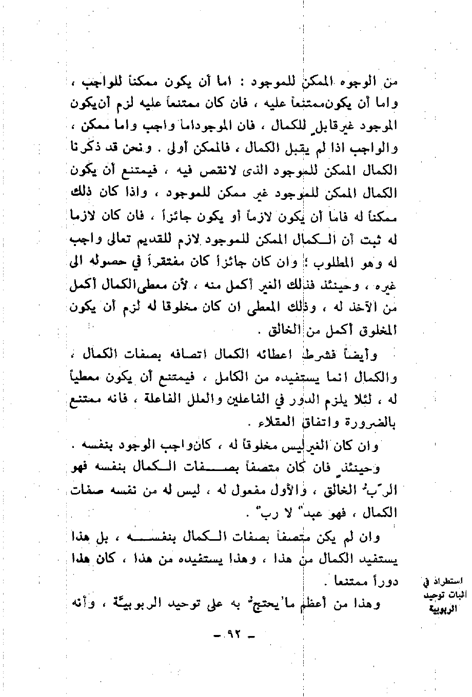 وإن كان الغير ليس مخلوقا له كان واجب الوجود بنفسه وحينئذ فإن كان متصفا بصفات الكمال بنفسه فهو الرب الخالق والأول مفعول له ليس له من نفسه صفات الكمال فهو عبد لا رب وإن لم يكن متصفا بصفات الكمال بنفسه بل هذا يستفيد الكمال من هذا وهذا يستفيده من هذا كان هذا دورا ممتنعا وهذا من أعظم ما يحتج به على توحيد الربوبية وأنه
