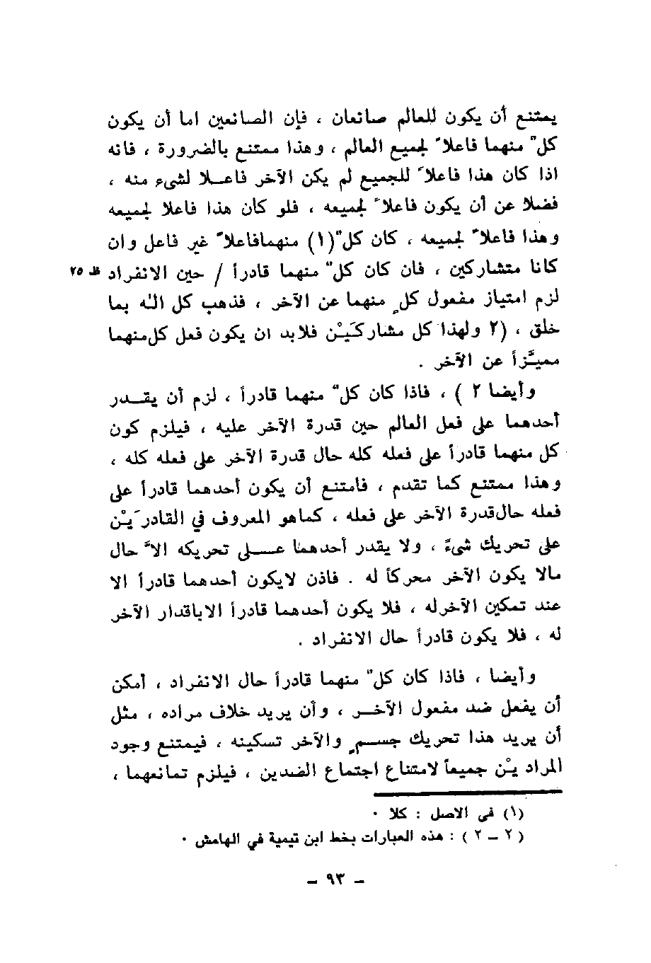 يمتنع أن يكون للعالم صانعان فإن الصانعين إما أن يكون كل منهما فاعلا لجميع العالم وهذا ممتنع بالضرورة فإنه إذا كان هذا فاعلا للجميع لم يكن الآخر فاعلا لشيء منه فضلا عن أن يكون فاعلا لجميعه فلو كان هذا فاعلا لجميعه وهذا فاعلا لجميعه كان كل منهما فاعلا غير فاعل وإن كانا متشاركين فإن كان كل منهما قادرا حين الانفراد لزم امتياز مفعول كل منهما عن الآخر فذهب كل إله بما خلق ولهذا كل مشاركين فلا بد أن يكون فعل كل منهما مميزا عن الآخر وأيضا فإذا كان كل منهما قادرا لزم أن يقدر أحدهما على فعل العالم حين قدرة الآخرة عليه فيلزم كون كل منهما قادرا على فعله كله حال قدرة الآخر على فعله كله وهذا ممتنع كما تقدم فامتنع أن يكون أحدهما قادرا على فعله حال قدرة الآخر على فعله كما هو المعروف في القادرين على تحريك شيء ولا يقدر أحدهما على تحريكه إلا حال ما لا يكون الآخر محركا له فإذن لا يكون احدهما قادرا إلا عند تمكين الآخر له فلا يكون أحدهما قادرا إلا بأقدار الآخر له فلا يكون قادرا حال الانفراد وأيضا فإذا كان كل منهما قادرا حال الانفراد أمكن أن يفعل ضد مفعول الآخر وأن يريد خلاف مراده مثل أن يريد هذا تحريك جسم والآخر تسكينه فيمتنع وجود المرادين جميعا لامتناع اجتماع الضدين فيلزم تمانعهما
