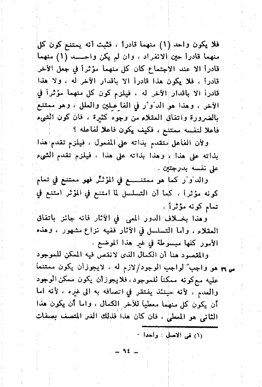 فلا يكون واحد منهما قادرا فثبت أنه يمتنع كون كل منهما قادرا حين الانفراد وإن لم يكن واحد منهما قادرا إلا عند الاجتماع كان كل منهما مؤثرا في جعل الآخر قادرا فلا يكون هذا قادرا إلا بأقدار الآخر له ولا هذا قادرا إلا بأقدار الآخر له فيلزم كون كل منهما مؤثرا في الآخر وهذا هو الدور في الفاعلين والعلل وهو ممتنع بالضرورة واتفاق العقلاء من وجوه كثيرة فإن كون الشيء فاعلا لنفسه ممتنع فكيف يكون فاعلا لفاعله