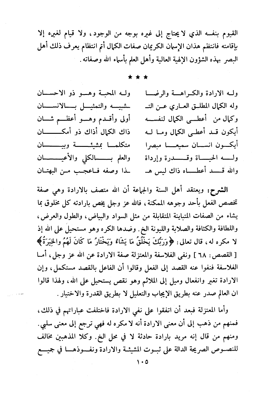 و منهم من قال إنه مريد بإرادة حادثة لا في محل الخ. وكلا المذهبين مخالف للنصوص الصريحة الدالة على ثبوت المشيئة والإرادة ونفوذها في جميع