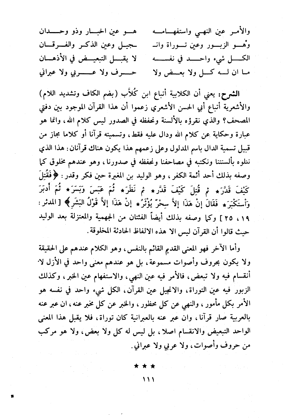 يعني أن الكلابية أتباع ابن كلّاب (بضم الكاف وتشديد اللام) والأشعرية أتباع أبي الحسن الأشعري زعموا أن هذا القرآن الموجود بين دفتي المصحف؟ والذي نقرؤه بالألسنة ونحفظه في الصدور ليس كلام اللّه، وانما هو عبارة وحكاية عن كلام اللّه ودال عليه فقط، وتسميته قرآنا أو كلاما مجاز من قبيل تسمية الدال باسم المدلول وعلى زعمهم هذا يكون هناك قرآنان: هذا الذي نتلوه بألسنتنا ونكتبه في مصاحفنا ونحفظه في صدورنا، وهو عندهم مخلوق كما وصفه بذلك أحد أئمة الكفر، وهو الوليد بن المغيرة حين فكر وقدر: فَقُتِلَ كَيْفَ قَدَّرَ ثُمَّ قُتِلَ كَيْفَ قَدَّرَ ثُمَّ نَظَرَ ثُمَّ عَبَسَ وبَسَرَ ثُمَّ أَدْبَرَ واسْتَكْبَرَ فَقالَ إِنْ هذا إِلَّا سِحْرٌ يُؤْثَرُ إِنْ هذا إِلَّا قَوْلُ الْبَشَرِ [المدثر: