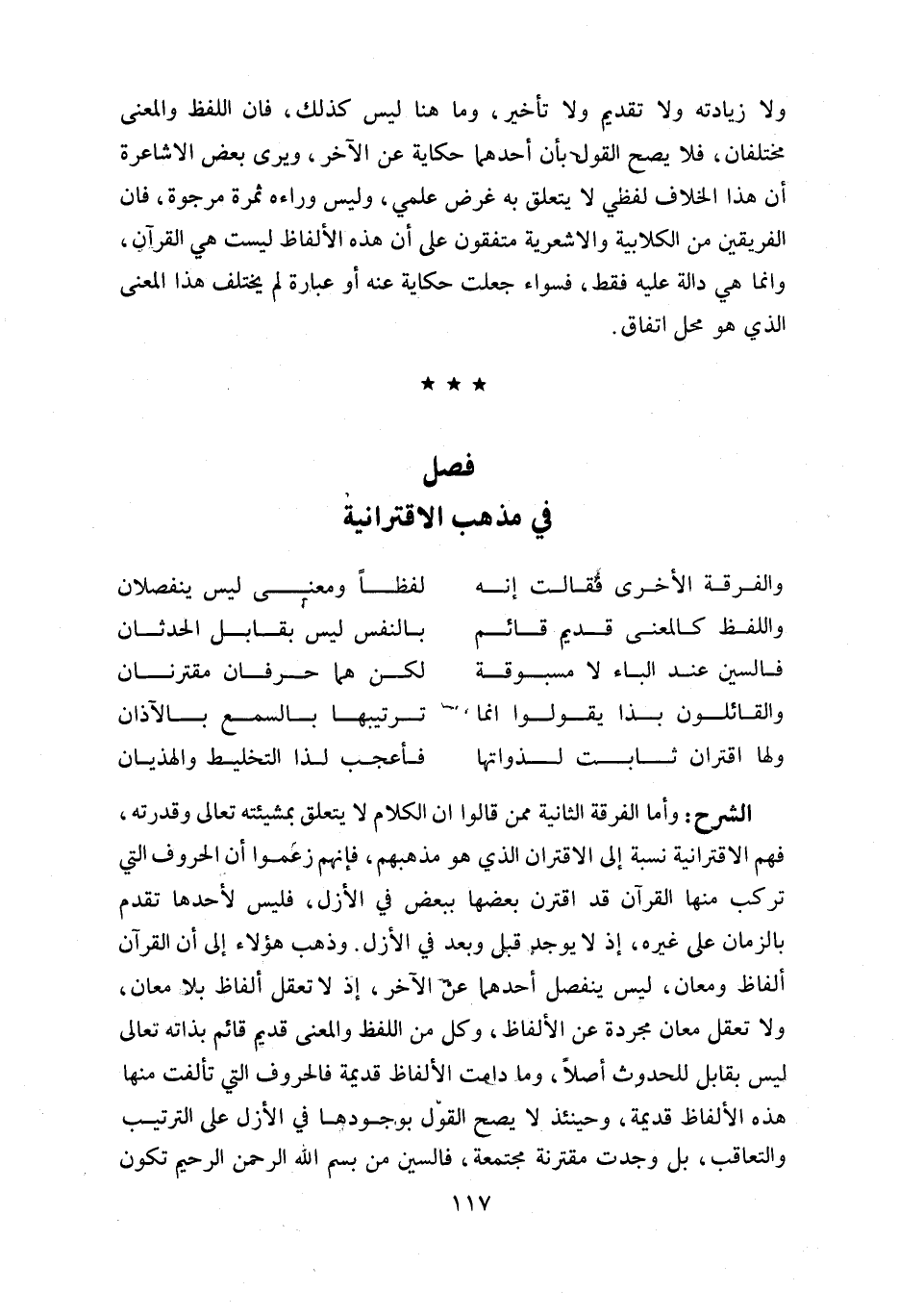 وأما الفرقة الثانية ممن قالوا ان الكلام لا يتعلق بمشيئته تعالى وقدرته، فهم الاقترانية نسبة إلى الاقتران الذي هو مذهبهم، فإنهم زعموا أن الحروف التي تركب منها القرآن قد اقترن بعضها ببعض في الأزل، فليس لأحدها تقدم بالزمان على غيره، إذ لا يوجد قبل وبعد في الأزل. وذهب هؤلاء إلى أن القرآن ألفاظ ومعان، ليس ينفصل أحدهما عن الآخر، إذ لا تعقل ألفاظ بلا معان، ولا تعقل معان مجردة عن الألفاظ، وكل من اللفظ والمعنى قديم قائم بذاته تعالى ليس بقابل للحدوث أصلا، وما دامت الألفاظ قديمة فالحروف التي تألفت منها هذه الألفاظ قديمة، وحينئذ لا يصح القول بوجودها في الأزل على الترتيب والتعاقب، بل وجدت مقترنة مجتمعة، فالسين من بسم اللّه الرحمن الرحيم تكون