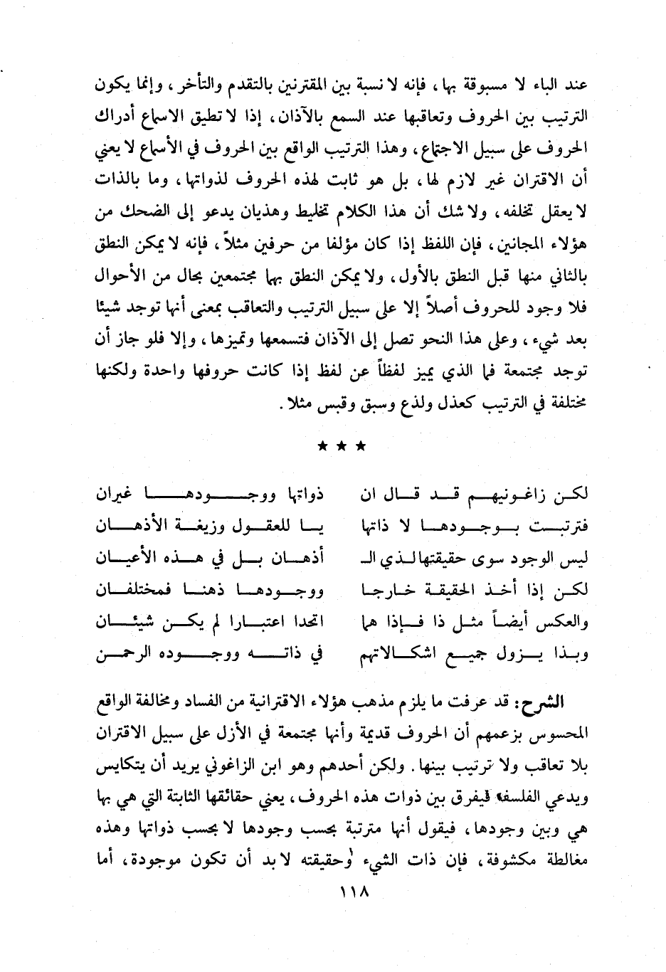 عند الباء لا مسبوقة بها، فإنه لا نسبة بين المقترنين بالتقدم والتأخر، وإنما يكون الترتيب بن الحروف وتعاقبها عند السمع با لآذان، إذا لا تطيق الاسماع إدراك الحروف على سبيل الاجتماع، وهذا الترتيب الواقع بين الحروف في الأسماع لا يعني أن الاقتران غير لازم لها، بل هو ثابت لهذه الحروف لذواتها، وما بالذات لا يعقل تخلفه، ولا شك أن هذا الكلام تخليط وهذيان يدعو إلى الضحك من هؤلاء المجانين، فإن اللفظ إذا كان مؤلفا من حرفين مثلا، فإنه لا يمكن النطق بالثاني منها قبل النطق بالأول، ولا يمكن النطق بهما مجتمعين بحال من الأحوال فلا وجود للحروف أصلا إلا على سبيل الترتيب والتعاقب بمعنى أنها توجد شيئا بعد شي ء، وعلى هذا النحو تصل إلى الآذان فتسمعها وتميزها، وإلا فلو جاز أن توجد مجتمعة فما الذي يميز لفظا عن لفظ إذا كانت حروفها واحدة ولكنها مختلفة في الترتيب كعذل ولذع وسبق وقبس مثلا.