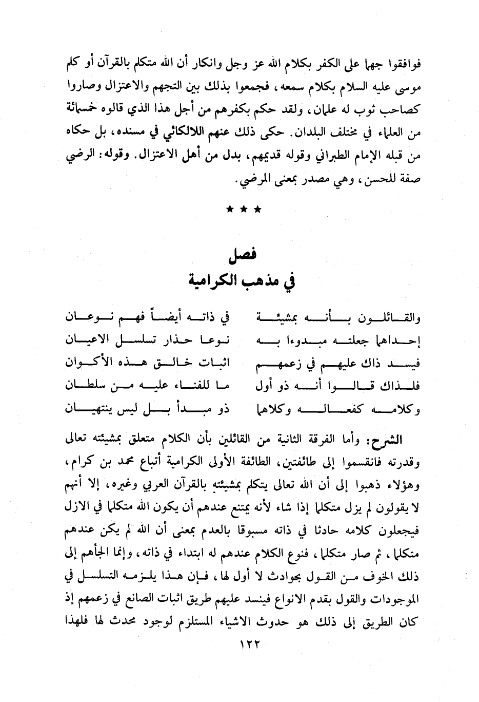 وأما الفرقة الثانية من القائلين بأن الكلام متعلق بمشيئته تعالى وقدرته فانقسموا إلى طائفتين، الطائفة الأولى الكرامية أتباع محمد بن كرام، وهؤلاء ذهبوا إلى أن اللّه تعالى يتكلم بمشيئته بالقرآن العربي وغيره، إلا أنهم لا يقولون لم يزل متكلما إذا شاء لأنه يمتنع عندهم أن يكون اللّه متكلما في الازل فيجعلون كلامه حادثا في ذاته مسبوقا بالعدم بمعنى أن اللّه لم يكن عندهم متكلما، ثم صار متكلما، فنوع الكلام عندهم له ابتداء في ذاته، وإنما الجأهم إلى ذلك الخوف من القول بحوادث لا أول لها، فإن هذا يلزمه التسلسل في الموجودات والقول بقدم الانواع فينسد عليهم طريق اثبات الصانع في زعمهم إذ كان الطريق إلى ذلك هو حدوث الاشياء المستلزم لوجود محدث لها فلهذا