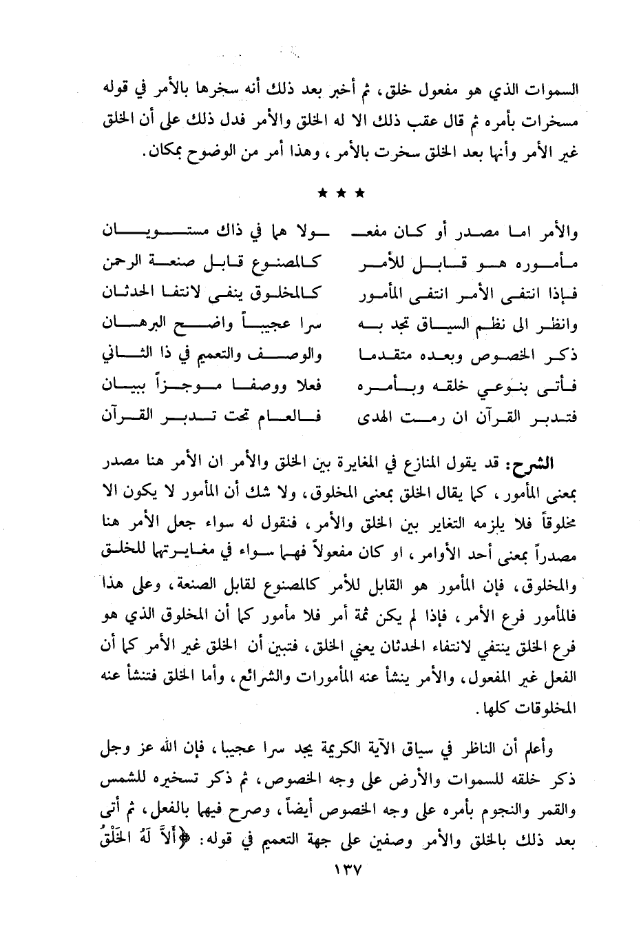 قد يقول المنازع في المغايرة بين الخلق والأمر ان الأمر هنا مصدر بمعنى المأمور، كما يقال الخلق بمعنى المخلوق، ولا شك أن المأمور لا يكون الا مخلوقا فلا يلزمه التغاير بين الخلق والأمر، فنقول له سواء جعل الأمر هنا مصدرا بمعنى أحد الأوامر، او كان مفعولا فهما سواء في مغايرتهما للخلق والمخلوق، فإن المأمور هو القابل للأمر كالمصنوع لقابل الصنعة، وعلى هذا فالمأمور فرع الأمر، فإذا لم يكن ثمة أمر فلا مأمور كما أن المخلوق الذي هو فرع الخلق ينتفي لانتفاء الحدثان يعني الخلق، فتبين أن الخلق غير الأمر كما أن الفعل غير المفعول، والأمر ينشأ عنه المأمورات والشرائع، وأما الخلق فتنشأ عنه المخلوقات كلها.