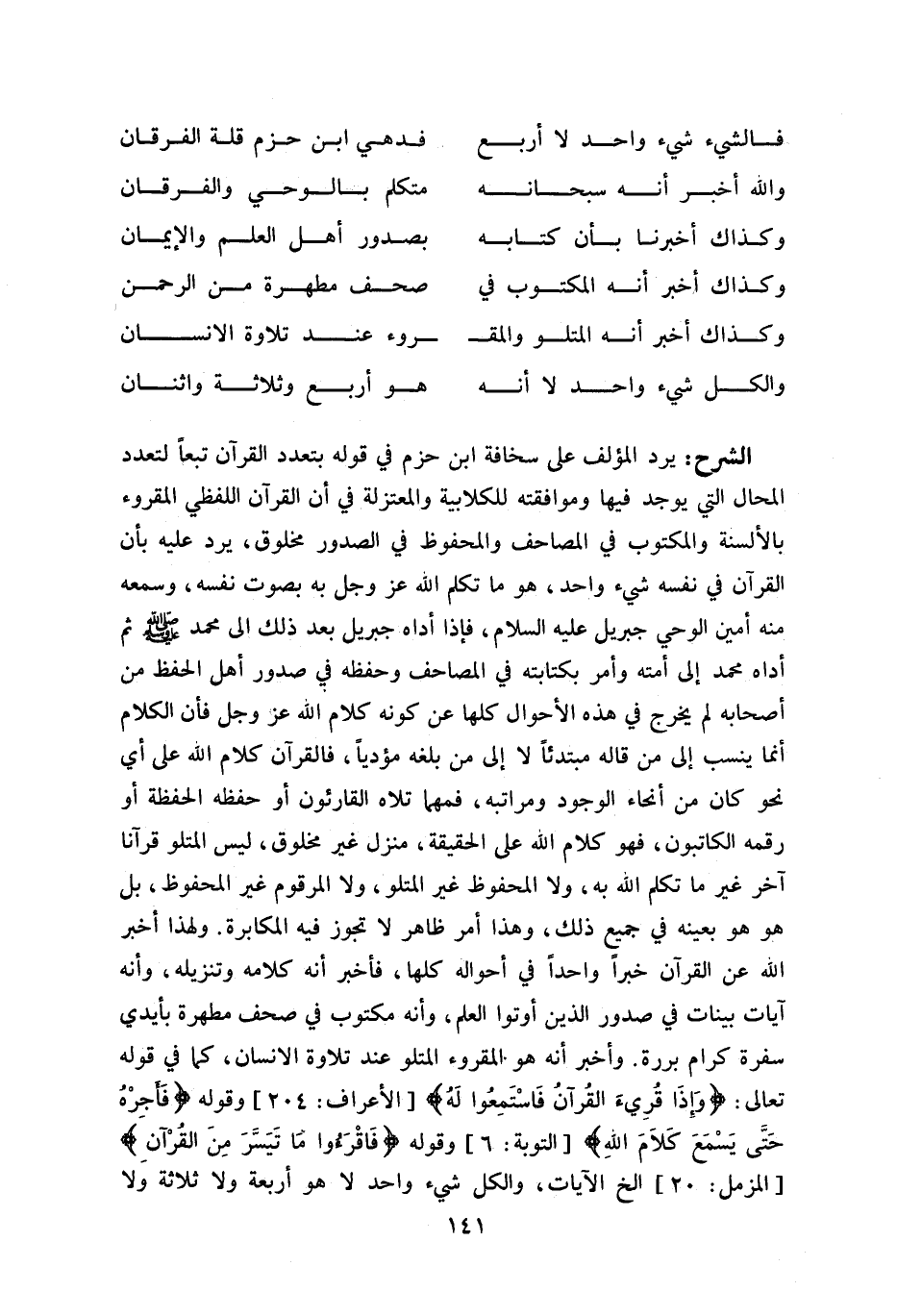 يرد المؤلف على سخافة ابن حزم في قوله بتعدد القرآن تبعا لتعدد المحال التي يوجد فيها وموافقته للكلابية والمعتزلة في أن القرآن اللفظي المقروء بالألسنة والمكتوب في المصاحف والمحفوظ في الصدور مخلوق، يرد عليه بأن القرآن في نفسه شي ء واحد، هو ما تكلم اللّه عز وجل به بصوت نفسه، وسمعه منه أمين الوحي جبريل عليه السلام، فإذا أداه جبريل بعد ذلك الى محمد صلّى اللّه عليه وسلّم ثم أداه محمد إلى أمته وأمر بكتابته في المصاحف وحفظه في صدور أهل الحفظ من أصحابه لم يخرج في هذه الأحوال كلها عن كونه كلام اللّه عز وجل فأن الكلام أنما ينسب إلى من قاله مبتدئا لا إلى من بلغه مؤديا، فالقرآن كلام اللّه على أي نحو كان من أنحاء الوجود ومراتبه، فمهما تلاه القارءون أو حفظه الحفظة أو رقمه الكاتبون، فهو كلام اللّه على الحقيقة، منزل غير مخلوق، ليس المتلو قرآنا آخر غير ما تكلم اللّه به، ولا المحفوظ غير المتلو، ولا المرقوم غير المحفوظ، بل هو هو بعينه في جميع ذلك، وهذا أمر ظاهر لا تجوز فيه المكابرة. ولهذا أخبر اللّه عن القرآن خبرا واحدا في أحواله كلها، فأخبر أنه كلامه وتنزيله، وأنه آيات بينات في صدور الذين أوتوا العلم، وأنه مكتوب في صحف مطهرة بأيدي سفرة كرام بررة. وأخبر أنه هو المقروء المتلو عند تلاوة الانسان، كما في قوله تعالى: وإِذا قُرِئَ الْقُرْآنُ فَاسْتَمِعُوا لَهُ [الأعراف: 204] وقوله فَأَجِرْهُ حَتَّى يَسْمَعَ كَلامَ اللَّهِ [التوبة: 6] وقوله فَاقْرَؤُا ما تَيَسَّرَ مِنَ الْقُرْآنِ [المزمل: 20] الخ الآيات، والكل شي ء واحد لا هو أربعة ولا ثلاثة ولا