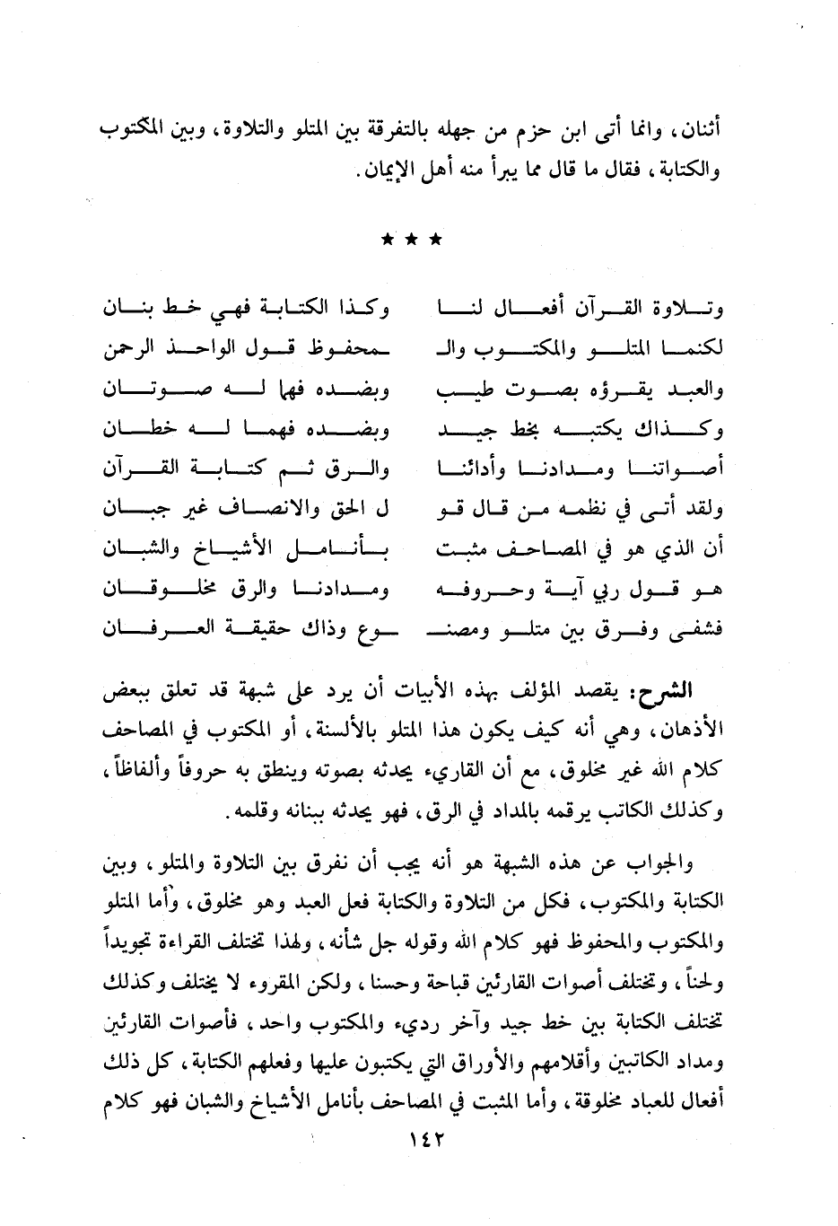 يقصد المؤلف بهذه الأبيات أن يرد على شبهة قد تعلق ببعض الأذهان، وهي أنه كيف يكون هذا المتلو بالألسنة، أو المكتوب في المصاحف كلام اللّه غير مخلوق، مع أن القارئ يحدثه بصوته وينطق به حروفا وألفاظا، وكذلك الكاتب يرقمه بالمداد في الرق، فهو يحدثه ببنانه وقلمه.