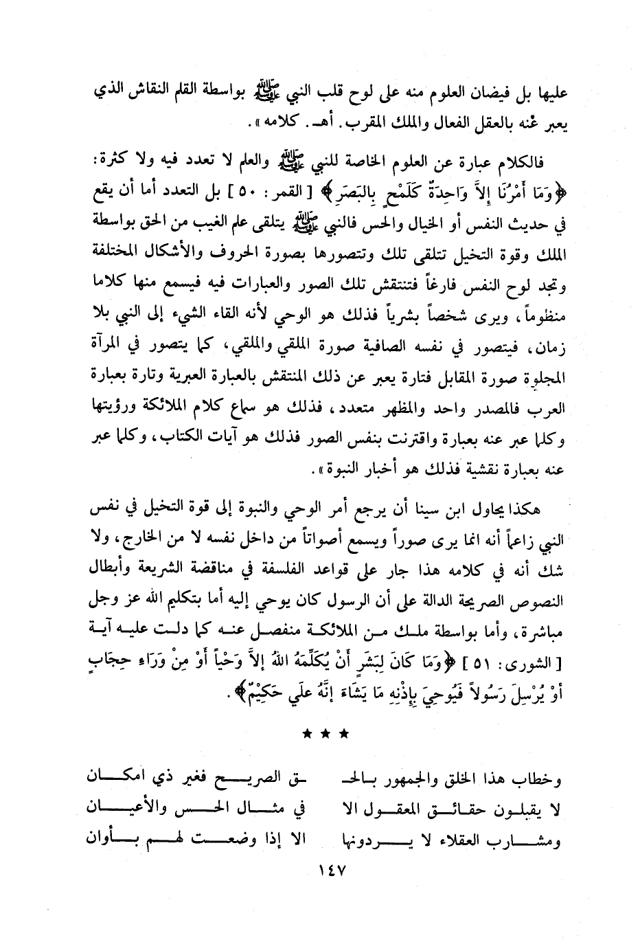 هكذا يحاول ابن سينا أن يرجع أمر الوحي والنبوة إلى قوة التخيل في نفس النبي زاعما أنه انما يرى صورا ويسمع أصواتا من داخل نفسه لا من الخارج، ولا شك أنه في كلامه هذا جار على قواعد الفلسفة في مناقضة الشريعة وأبطال النصوص الصريحة الدالة على أن الرسول كان يوحي إليه أما بتكليم اللّه عز وجل مباشرة، وأما بواسطة ملك من الملائكة منفصل عنه كما دلت عليه آية [الشورى: 51] وما كانَ لِبَشَرٍ أَنْ يُكَلِّمَهُ اللَّهُ إِلَّا وَحْياً أَوْ مِنْ وَراءِ حِجابٍ أَوْ يُرْسِلَ رَسُولًا فَيُوحِيَ بِإِذْنِهِ ما يَشاءُ إِنَّهُ عَلِيٌّ حَكِيمٌ.