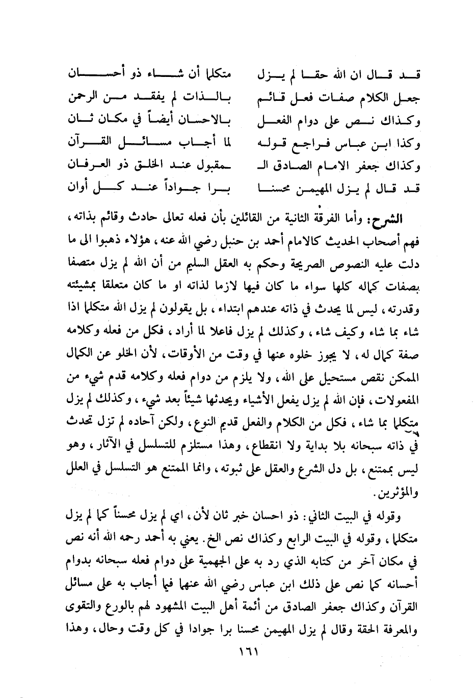 وأما الفرقة الثانية من القائلين بأن فعله تعالى حادث وقائم بذاته، فهم أصحاب الحديث كالإمام أحمد بن حنبل رضي اللّه عنه، هؤلاء ذهبوا الى ما دلت عليه النصوص الصريحة وحكم به العقل السليم من أن اللّه لم يزل متصفا بصفات كماله كلها سواء ما كان فيها لازما لذاته او ما كان متعلقا بمشيئته وقدرته، ليس لما يحدث في ذاته عندهم ابتداء، بل يقولون لم يزل اللّه متكلما اذا شاء بما شاء وكيف شاء، وكذلك لم يزل فاعلا لما أراد، فكل من فعله وكلامه صفة كمال له، لا يجوز خلوه عنها في وقت من الأوقات، لأن الخلو عن الكمال الممكن نقص مستحيل على اللّه، ولا يلزم من دوام فعله وكلامه قدم شي ء من المفعولات، فإن اللّه لم يزل يفعل الأشياء ويحدثها شيئا بعد شي ء، وكذلك لم يزل متكلما بما شاء، فكل من الكلام والفعل قديم النوع، ولكن آحاده لم تزل تحدث في ذاته سبحانه بلا بداية ولا انقطاع، وهذا مستلزم للتسلسل في الآثار، وهو ليس بممتنع، بل دل الشرع والعقل على ثبوته، وانما الممتنع هو التسلسل في العلل والمؤثرين.