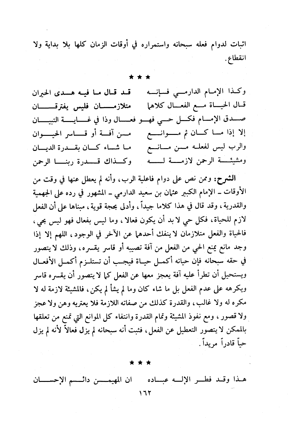 وممن نص على دوام فاعلية الرب، وأنه لم يعطل عنها في وقت من الأوقات- الإمام الكبير عثمان بن سعيد الدارمي- المشهور في رده على الجهمية والقدرية، وقد قال في هذا كلاما جيدا، وأدلى بحجة قوية، مبناها على أن الفعل لازم للحياة، فكل حي لا بد أن يكون فعالا، وما ليس بفعال فهو ليس بحي، فالحياة والفعل متلازمان لا ينفك أحدهما عن الآخر في الوجود، اللهم إلا إذا وجد مانع يمنع الحي من الفعل من آفة تصيبه أو قاسر يقسره، وذلك لا يتصور في حقه سبحانه فإن حياته أكمل حياة فيجب أن تستلزم أكمل الأفعال ويستحيل أن تطرأ عليه آفة يعجز معها عن الفعل كما لا يتصور أن يقسره قاسر ويكرهه على عدم الفعل بل ما شاء كان وما لم يشأ لم يكن، فالمشيئة لازمة له لا مكره له ولا غالب، والقدرة كذلك من صفاته اللازمة فلا يعتريه وهن ولا عجز ولا قصور، ومع نفوذ المشيئة وتمام القدرة وانتفاء كل الموانع التي تمنع من تعلقها بالممكن لا يتصور التعطيل عن الفعل، فثبت أنه سبحانه لم يزل فعالا لأنه لم يزل حيا قادرا مريدا.