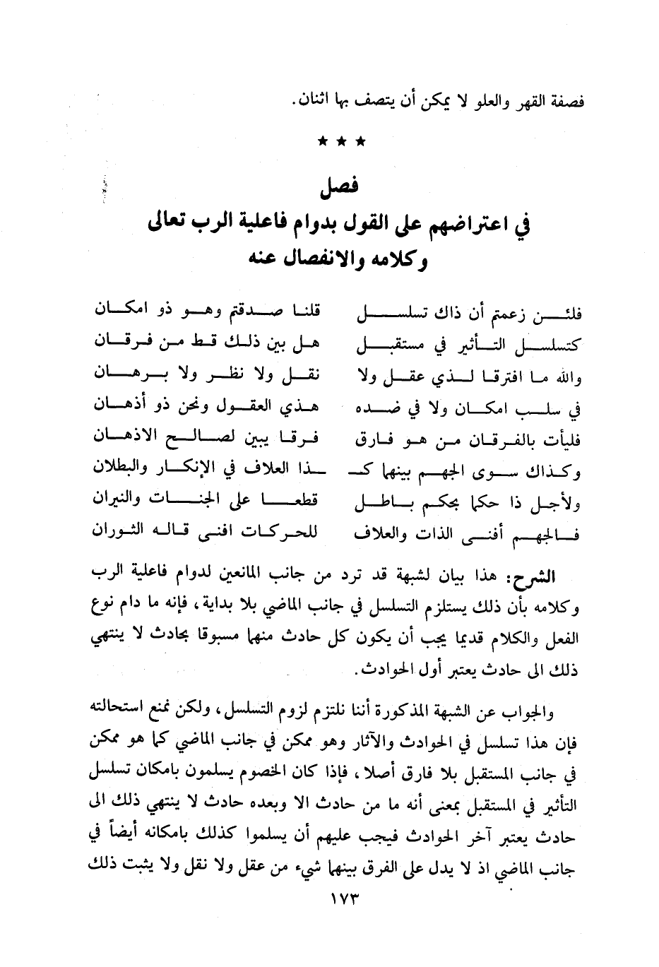 هذا بيان لشبهة قد ترد من جانب المانعين لدوام فاعلية الرب وكلامه بأن ذلك يستلزم التسلسل في جانب الماضي بلا بداية، فإنه ما دام نوع الفعل والكلام قديما يجب أن يكون كل حادث منهما مسبوقا بحادث لا ينتهي ذلك الى حادث يعتبر أول الحوادث.