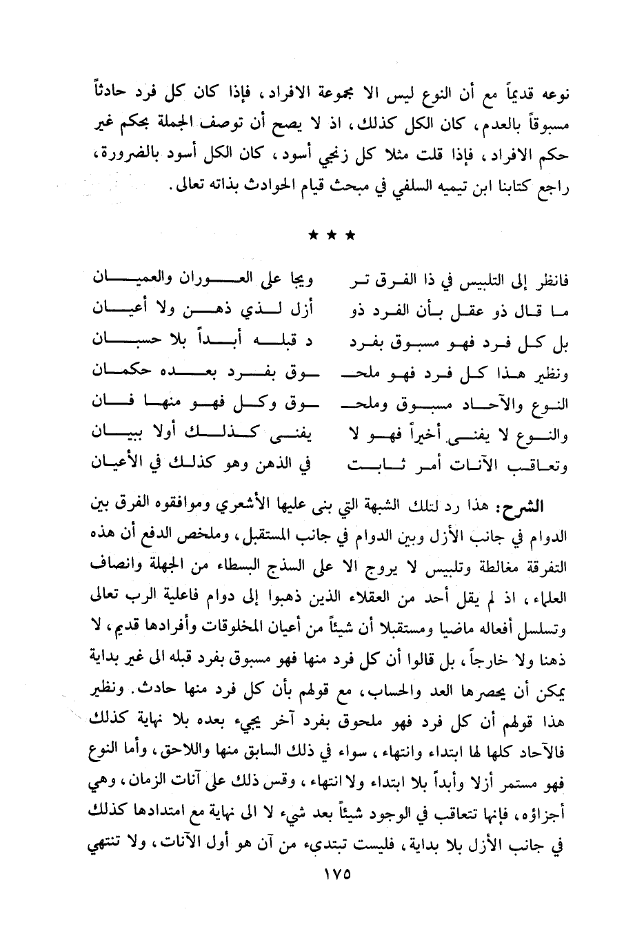 نوعه قديما مع أن النوع ليس الا مجموعة الافراد، فإذا كان كل فرد حادثا مسبوقا بالعدم، كان الكل كذلك، اذ لا يصح أن توصف الجملة بحكم غير حكم الافراد، فإذا قلت مثلا كل زنجي أسود، كان الكل أسود بالضرورة، راجع كتابنا ابن تيمية السلفي في مبحث قيام الحوادث بذاته تعالى.