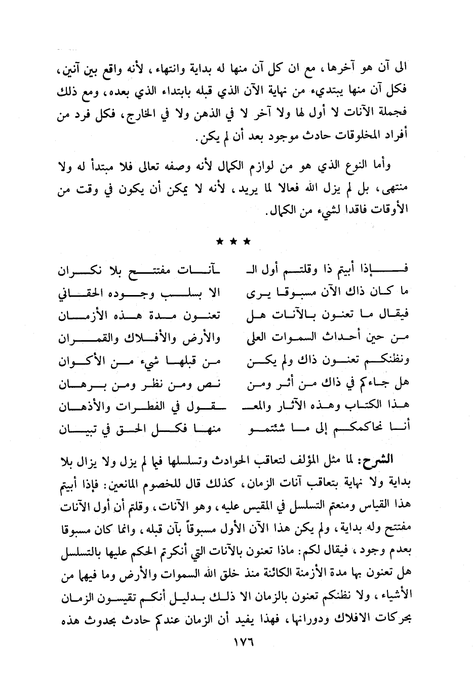 لما مثل المؤلف لتعاقب الحوادث وتسلسلها فيما لم يزل ولا يزال بلا بداية ولا نهاية بتعاقب آنات الزمان، كذلك قال للخصوم المانعين: فإذا أبيتم هذا القياس ومنعتم التسلسل في المقيس عليه، وهو الآنات، وقلتم أن أول الآنات مفتتح وله بداية، ولم يكن هذا الآن الأول مسبوقا بآن قبله، وانما كان مسبوقا بعدم وجود، فيقال لكم: ما ذا تعنون بالآنات التي أنكرتم الحكم عليها بالتسلسل هل تعنون بها مدة الأزمنة الكائنة منذ خلق اللّه السموات والأرض وما فيهما من الأشياء، ولا نظنكم تعنون بالزمان الا ذلك بدليل أنكم تقيسون الزمان بحركات الافلاك ودورانها، فهذا يفيد أن الزمان عندكم حادث بحدوث هذه