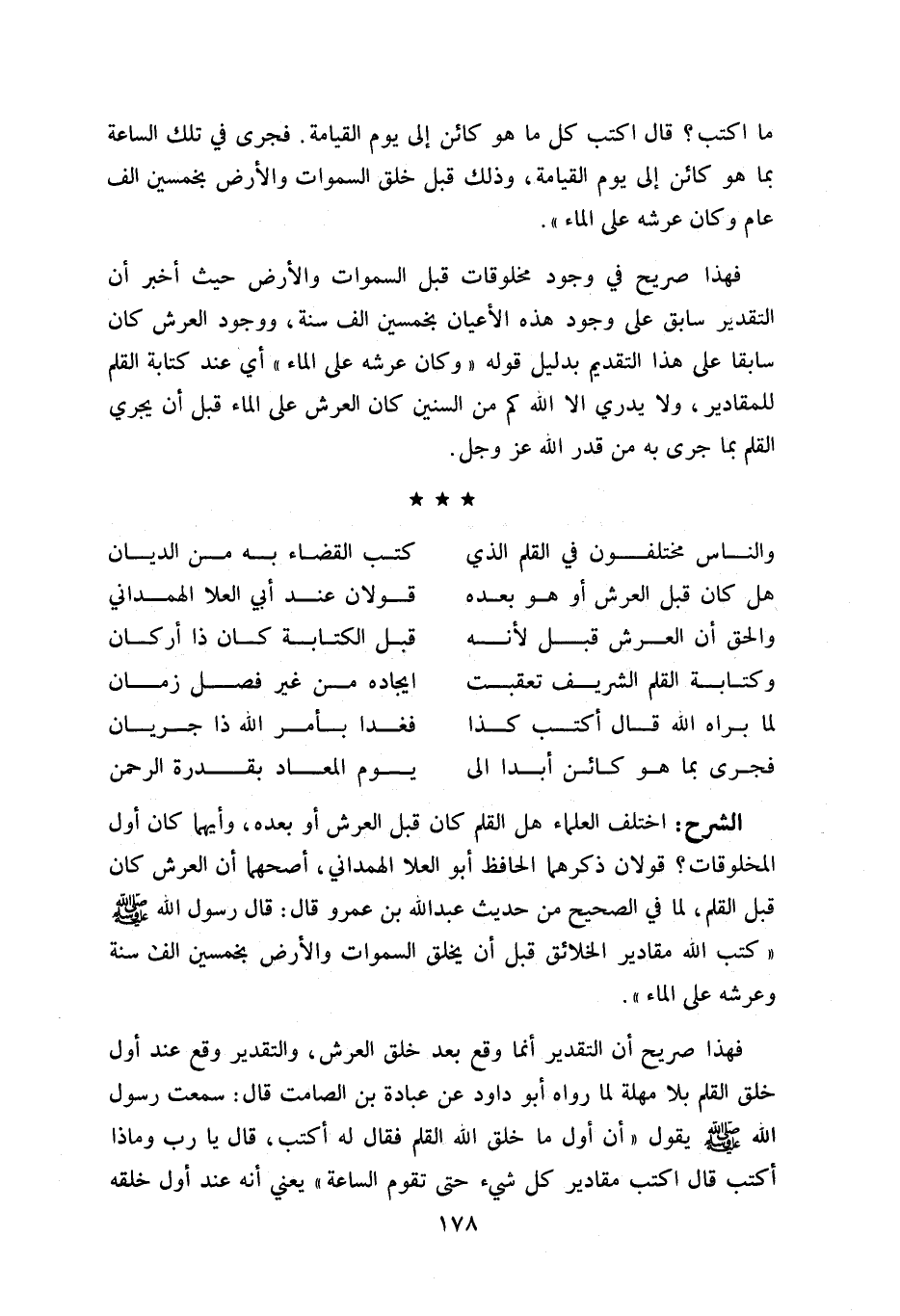فهذا صريح في وجود مخلوقات قبل السموات والأرض حيث أخبر أن التقدير سابق على وجود هذه الأعيان بخمسين الف سنة، ووجود العرش كان سابقا على هذا التقديم بدليل قوله «و كان عرشه على الماء» أي عند كتابة القلم للمقادير، ولا يدري الا اللّه كم من السنين كان العرش على الماء قبل أن يجري القلم بما جرى به من قدر اللّه عز وجل.