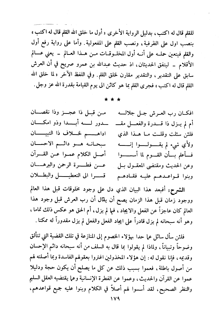 للقلم قال له اكتب، بدليل الرواية الأخرى «أول ما خلق اللّه القلم قال له اكتب» بنصب اوّل على الظرفية، ونصب القلم على المفعولية. وأما على رواية رفع أول والقلم فيتعين حمله على أنه أول المخلوقات من هذا العالم- يعني عالم الأقلام- ليتفق الحديثان، اذ حديث عبد اللّه بن عمرو صريح في أن العرش سابق على التقدير، والتقدير مقارن لخلق القلم. وفي اللفظ الآخر «لما خلق اللّه القلم قال له اكتب» فجرى القلم بما هو كائن الى يوم القيامة بقدرة اللّه عز وجل.
