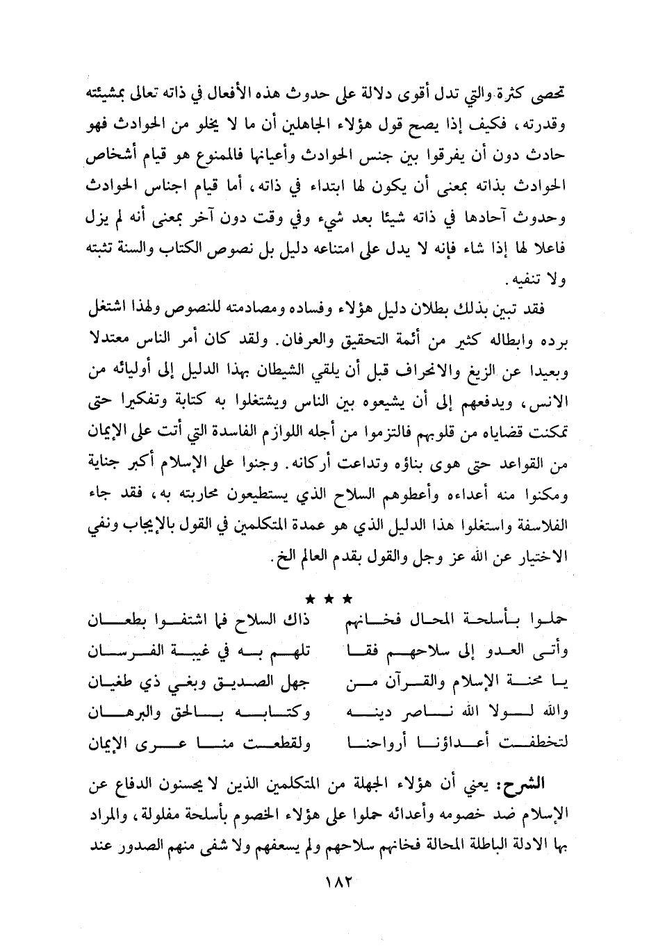 فقد تبين بذلك بطلان دليل هؤلاء وفساده ومصادمته للنصوص ولهذا اشتغل برده وابطاله كثير من أئمة التحقيق والعرفان. ولقد كان أمر الناس معتدلا وبعيدا عن الزيغ والانحراف قبل أن يلقي الشيطان بهذا الدليل إلى أوليائه من الانس، ويدفعهم إلى أن يشيعوه بين الناس ويشتغلوا به كتابة وتفكيرا حتى تمكنت قضاياه من قلوبهم فالتزموا من أجله اللوازم الفاسدة التي أتت على الإيمان من القواعد حتى هوى بناؤه وتداعت أركانه. وجنوا على الإسلام أكبر جناية ومكنوا منه أعداءه وأعطوهم السلاح الذي يستطيعون محاربته به، فقد جاء الفلاسفة واستغلوا هذا الدليل الذي هو عمدة المتكلمين في القول بالإيجاب ونفي الاختيار عن اللّه عز وجل والقول بقدم العالم الخ.