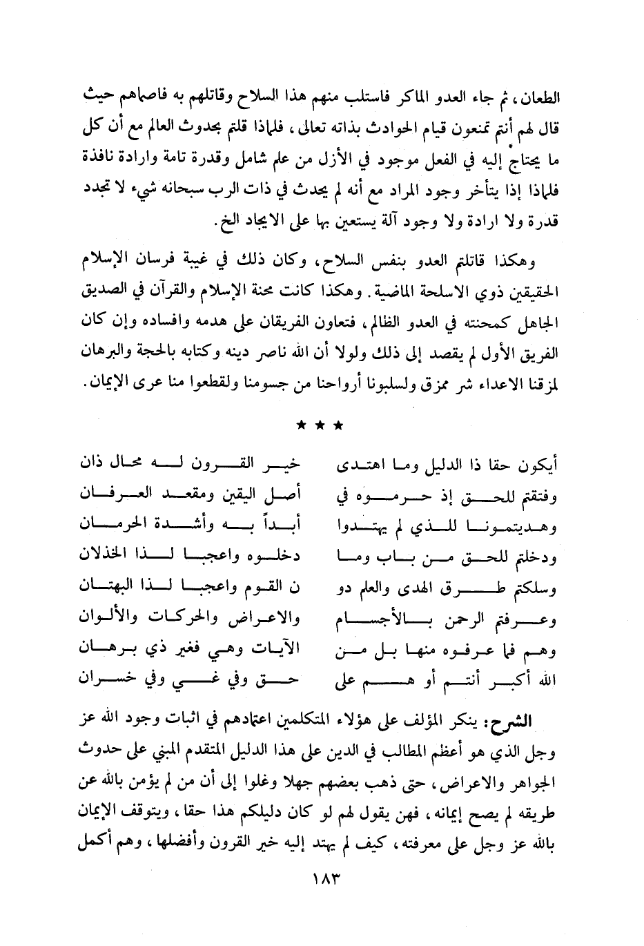 الطعان، ثم جاء العدو الماكر فاستلب منهم هذا السلاح وقاتلهم به فاصماهم حيث قال لهم أنتم تمنعون قيام الحوادث بذاته تعالى، فلما ذا قلتم بحدوث العالم مع أن كل ما يحتاج إليه في الفعل موجود في الأزل من علم شامل وقدرة تامة وإرادة نافذة فلما ذا إذا يتأخر وجود المراد مع أنه لم يحدث في ذات الرب سبحانه شي ء لا تجدد قدرة ولا إرادة ولا وجود آلة يستعين بها على الايجاد الخ.