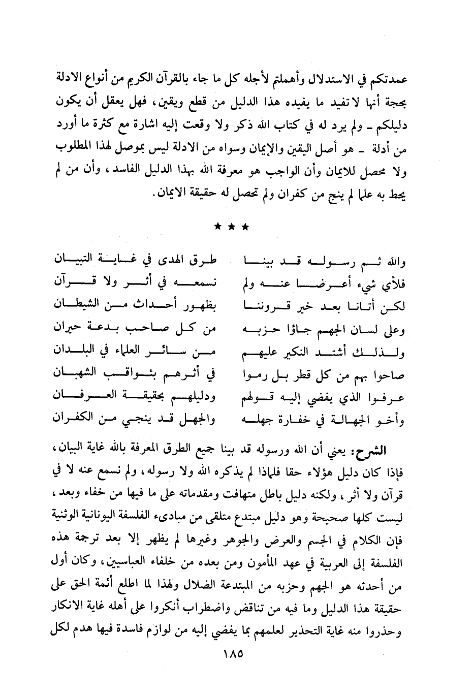 يعني أن اللّه ورسوله قد بينا جميع الطرق المعرفة باللّه غاية البيان، فإذا كان دليل هؤلاء حقا فلما ذا لم يذكره اللّه ولا رسوله، ولم نسمع عنه لا في قرآن ولا أثر، ولكنه دليل باطل متهافت ومقدماته على ما فيها من خفاء وبعد، ليست كلها صحيحة وهو دليل مبتدع متلقى من مبادي الفلسفة اليونانية والوثنية فإن الكلام في الجسم والعرض والجوهر وغيرها لم يظهر إلا بعد ترجمة هذه الفلسفة إلى العربية في عهد المأمون ومن بعده من خلفاء العباسيين، وكان أول من أحدثه هو الجهم وحزبه من المبتدعة الضلال ولهذا لما اطلع أئمة الحق على حقيقة هذا الدليل وما فيه من تناقض واضطراب أنكروا على أهله غاية الانكار وحذروا منه غاية التحذير لعلمهم بما يفضي إليه من لوازم فاسدة فيها هدم لكل
