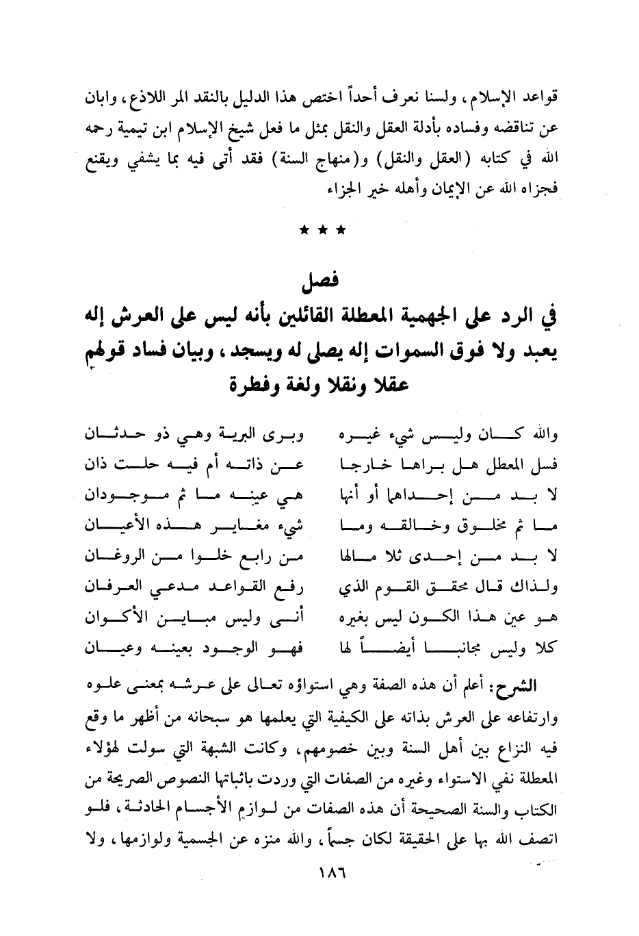 القائلين بأنه ليس على العرش إله يعبد ولا فوق السموات إله يصلى له ويسجد، وبيان فساد قولهم عقلا ونقلا ولغة وفطرة