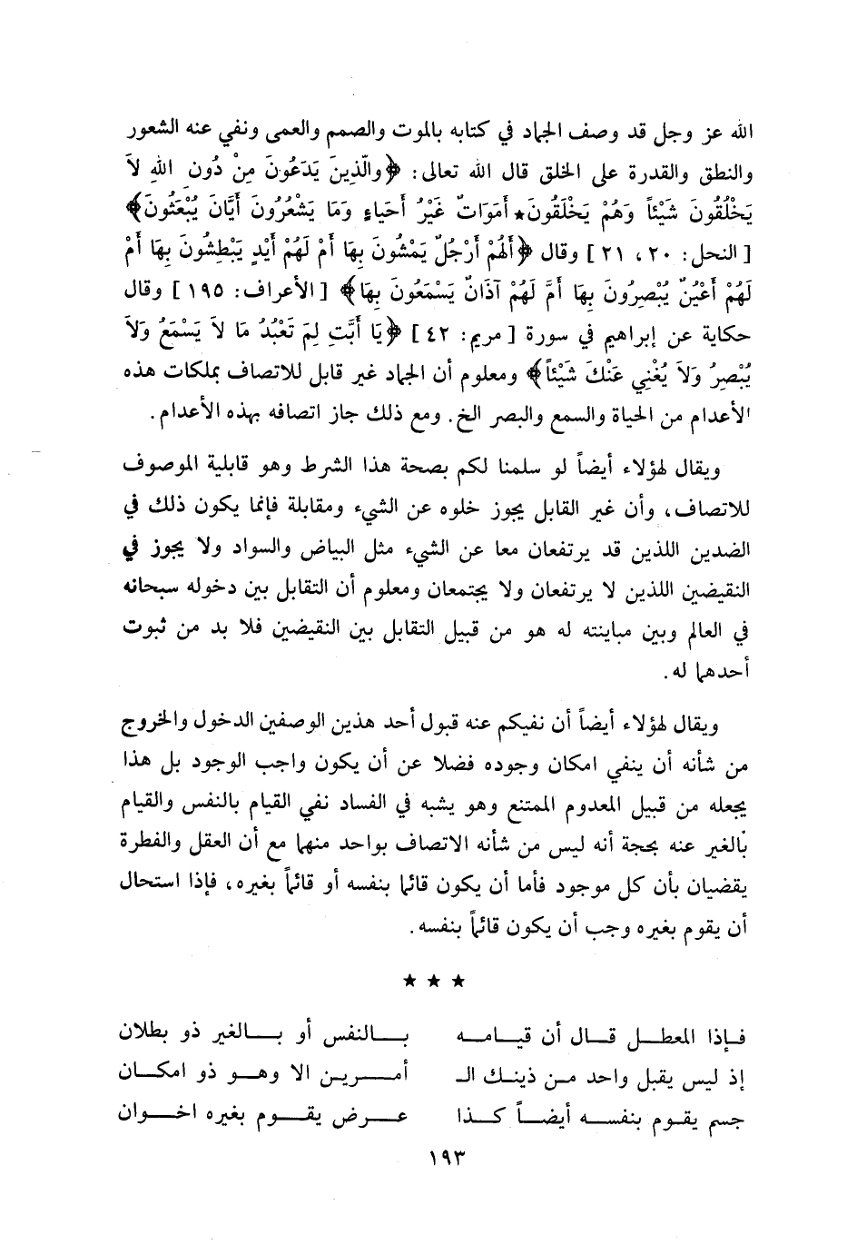 و يقال لهؤلاء أيضا لو سلمنا لكم بصحة هذا الشرط وهو قابلية الموصوف للاتصاف، وأن غير القابل يجوز خلوه عن الشي ء ومقابلة فإنما يكون ذلك في الضدين اللذين قد يرتفعان معا عن الشي ء مثل البياض والسواد ولا يجوز في النقيضين اللذين لا يرتفعان ولا يجتمعان ومعلوم أن التقابل بين دخوله سبحانه في العالم وبين مباينته له هو من قبيل التقابل بين النقيضين فلا بد من ثبوت أحدهما له.