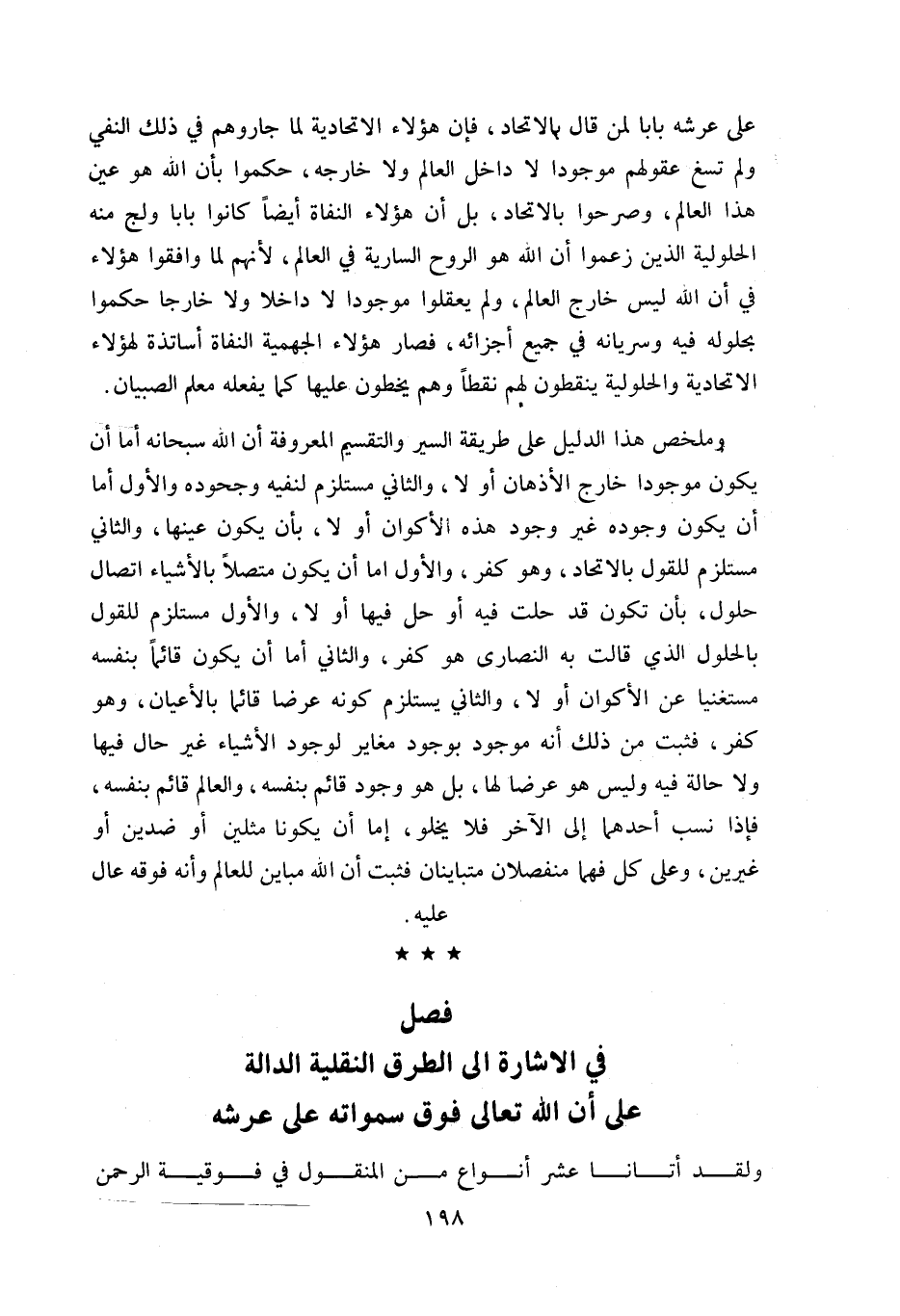 على عرشه بابا لمن قال بالاتحاد، فإن هؤلاء الاتحادية لما جاروهم في ذلك النفي ولم تسغ عقولهم موجودا لا داخل العالم ولا خارجه، حكموا بأن اللّه هو عين هذا العالم، وصرحوا بالاتحاد، بل أن هؤلاء النفاة أيضا كانوا بابا ولج منه الحلولية الذين زعموا أن اللّه هو الروح السارية في العالم، لأنهم لما وافقوا هؤلاء في أن اللّه ليس خارج العالم، ولم يعقلوا موجودا لا داخلا ولا خارجا حكموا بحلوله فيه وسريانه في جميع أجزائه، فصار هؤلاء الجهمية النفاة أساتذة لهؤلاء الاتحادية والحلولية ينقطون لهم نقطا وهم يخطون عليها كما يفعله معلم الصبيان.