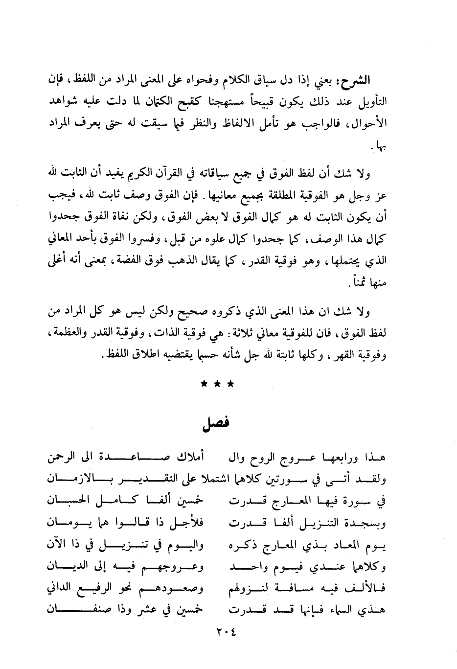 و لا شك أن لفظ الفوق في جميع سياقاته في القرآن الكريم يفيد أن الثابت للّه عز وجل هو الفوقية المطلقة بجميع معانيها. فإن الفوق وصف ثابت للّه، فيجب أن يكون الثابت له هو كمال الفوق لا بعض الفوق، ولكن نفاة الفوق جحدوا كمال هذا الوصف، كما جحدوا كمال علوه من قبل، وفسروا الفوق بأحد المعاني الذي يحتملها، وهو فوقية القدر، كما يقال الذهب فوق الفضة، بمعنى أنه أغلى منها ثمنا.