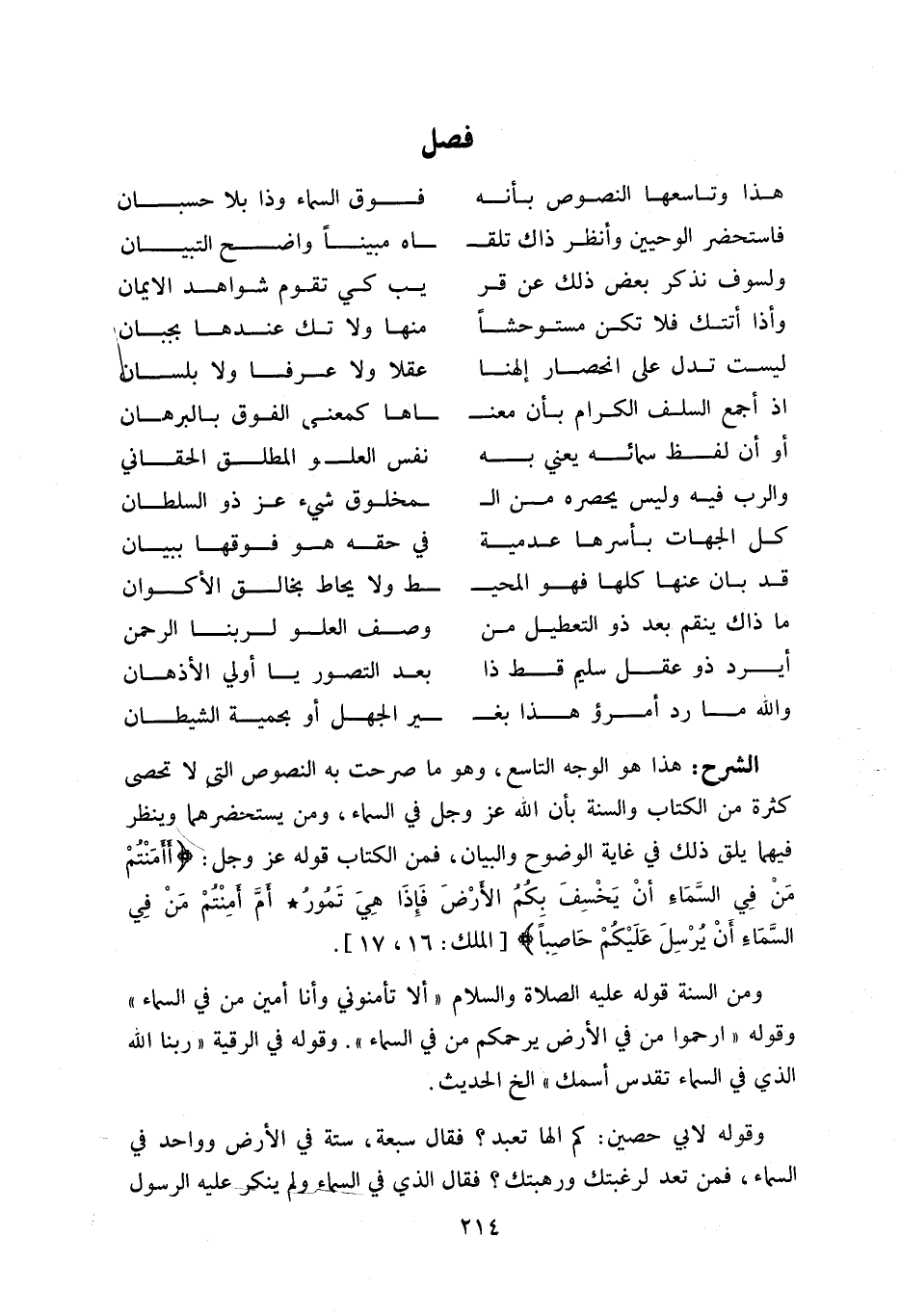 هذا هو الوجه التاسع، وهو ما صرحت به النصوص التى لا تحصى كثرة من الكتاب والسنة بأن اللّه عز وجل في السماء، ومن يستحضرهما وينظر فيهما يلق ذلك في غاية الوضوح والبيان، فمن الكتاب قوله عز وجل: أَ أَمِنْتُمْ مَنْ فِي السَّماءِ أَنْ يَخْسِفَ بِكُمُ الْأَرْضَ فَإِذا هِيَ تَمُورُ* أَمْ أَمِنْتُمْ مَنْ فِي السَّماءِ أَنْ يُرْسِلَ عَلَيْكُمْ حاصِباً [الملك: 16، 17].
