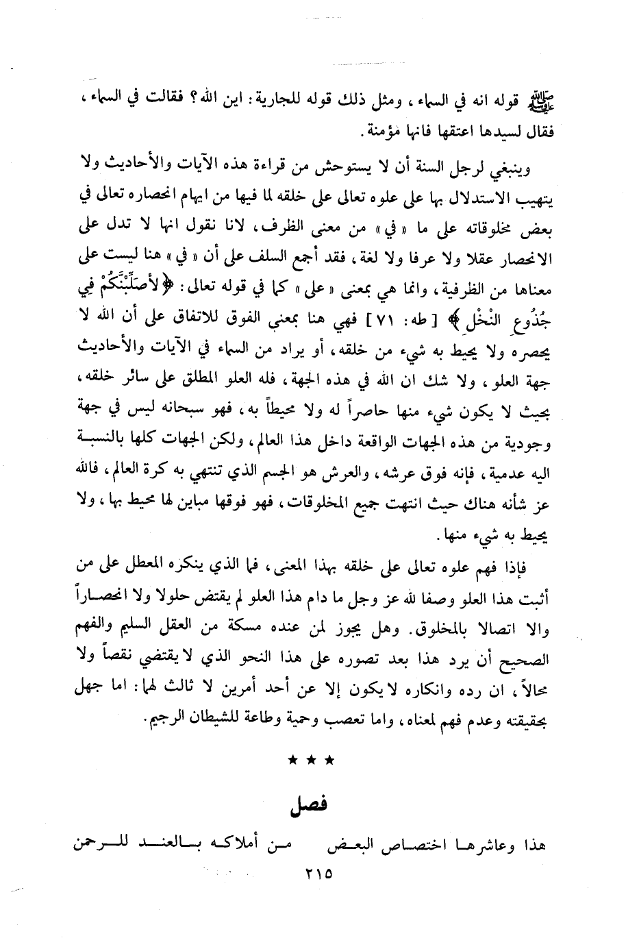 و ينبغي لرجل السنة أن لا يستوحش من قراءة هذه الآيات والأحاديث ولا يتهيب الاستدلال بها على علوه تعالى على خلقه لما فيها من ايهام انحصاره تعالى في بعض مخلوقاته على ما «في» من معنى الظرف، لانا نقول انها لا تدل على الانحصار عقلا ولا عرفا ولا لغة، فقد أجمع السلف على أن «في» هنا ليست على معناها من الظرفية، وانما هي بمعنى «على» كما في قوله تعالى: لَأُصَلِّبَنَّكُمْ فِي جُذُوعِ النَّخْلِ [طه: 71] فهي هنا بمعنى الفوق للاتفاق على أن اللّه لا يحصره ولا يحيط به شي ء من خلقه، أو يراد من السماء في الآيات والأحاديث جهة العلو، ولا شك أن اللّه في هذه الجهة، فله العلو المطلق على سائر خلقه، بحيث لا يكون شي ء منها حاصرا له ولا محيطا به، فهو سبحانه ليس في جهة وجودية من هذه الجهات الواقعة داخل هذا العالم، ولكن الجهات كلها بالنسبة إليه عدمية، فإنه فوق عرشه، والعرش هو الجسم الذي تنتهي به كرة العالم، فاللّه عز شأنه هناك حيث انتهت جميع المخلوقات، فهو فوقها مباين لها محيط بها، ولا يحيط به شي ء منها.
