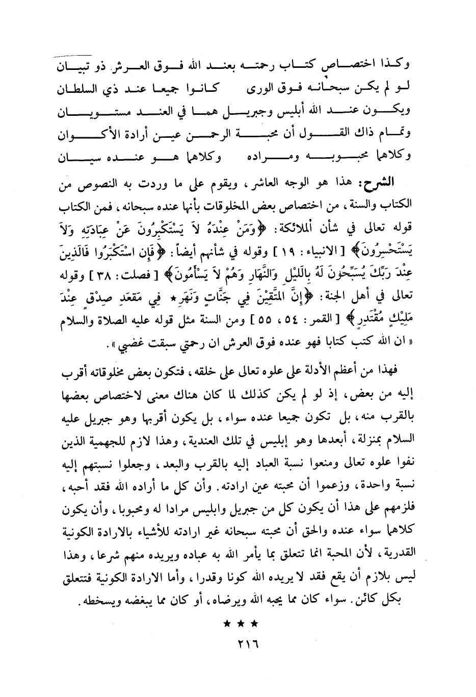 هذا هو الوجه العاشر، ويقوم على ما وردت به النصوص من الكتاب والسنة، من اختصاص بعض المخلوقات بأنها عنده سبحانه، فمن الكتاب قوله تعالى في شأن الملائكة: ومَنْ عِنْدَهُ لا يَسْتَكْبِرُونَ عَنْ عِبادَتِهِ ولا يَسْتَحْسِرُونَ [الأنبياء: 19] وقوله في شأنهم أيضا: فَإِنِ اسْتَكْبَرُوا فَالَّذِينَ عِنْدَ رَبِّكَ يُسَبِّحُونَ لَهُ بِاللَّيْلِ والنَّهارِ وهُمْ لا يَسْأَمُونَ [فصلت: 38] وقوله تعالى في أهل الجنة: إِنَّ الْمُتَّقِينَ فِي جَنَّاتٍ ونَهَرٍ* فِي مَقْعَدِ صِدْقٍ عِنْدَ مَلِيكٍ مُقْتَدِرٍ [القمر: 54، 55] ومن السنة مثل قوله عليه الصلاة والسلام «ان اللّه كتب كتابا فهو عنده فوق العرش ان رحمتي سبقت غضبي».