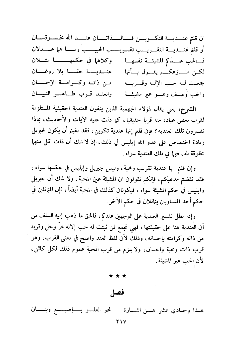 و إن قلتم انها عندية تقريب ومحبة، وليس جبريل وإبليس في حكمها سواء، فقد نقضتم مذهبكم، فإنكم تقولون ان المشيئة عين المحبة، ولا شك أن جبريل وابليس في حكم المشيئة سواء، فيكونان كذلك في المحبة أيضا، فإن المتماثلين في حكم أحد المتساويين يتماثلان في حكم الآخر.