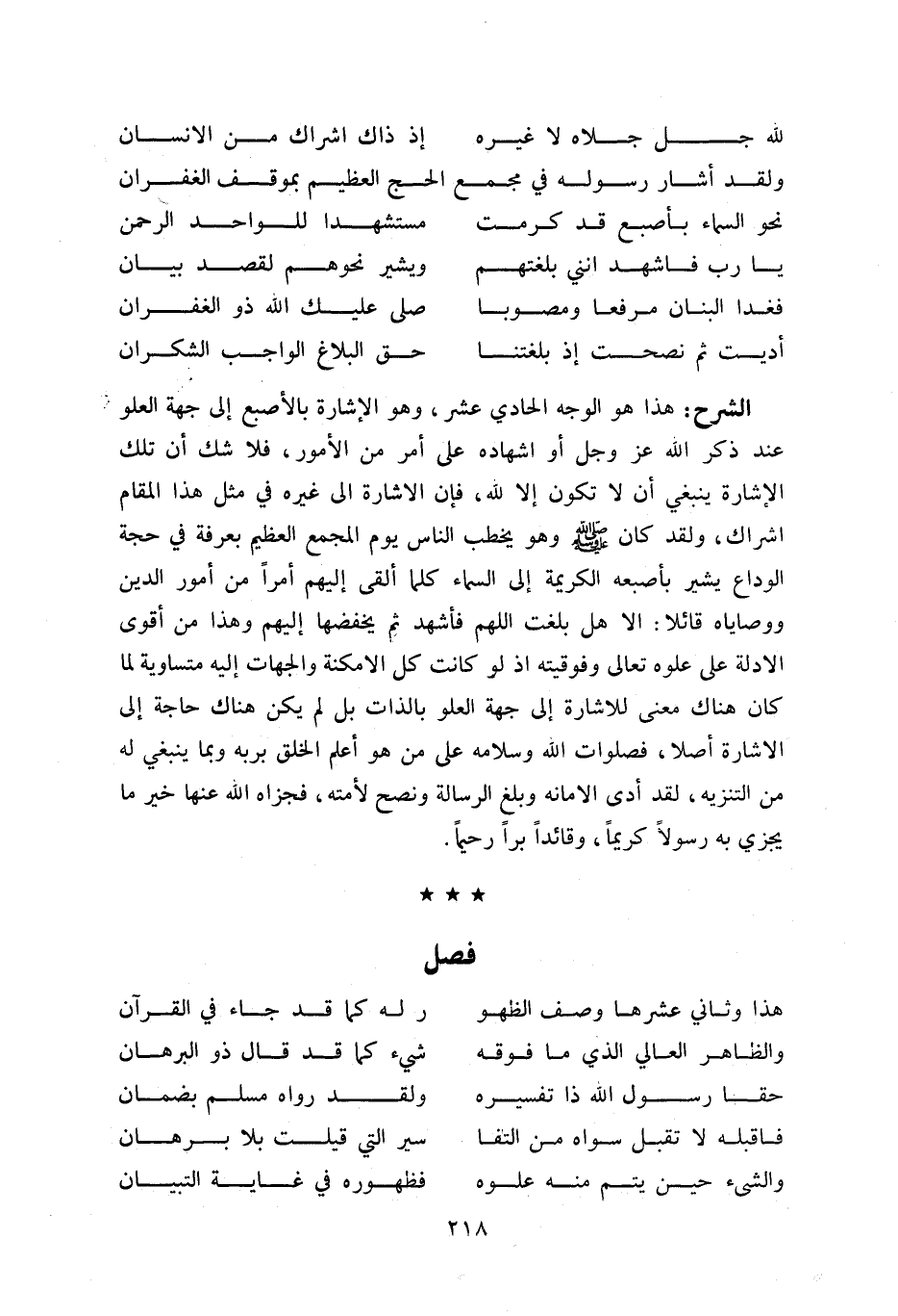 هذا هو الوجه الحادي عشر، وهو الإشارة بالأصبع إلى جهة العلو عند ذكر اللّه عز وجل أو اشهاده على أمر من الأمور، فلا شك أن تلك الإشارة ينبغي أن لا تكون إلا للّه، فإن الاشارة الى غيره في مثل هذا المقام اشراك، ولقد كان صلّى اللّه عليه وسلّم وهو يخطب الناس يوم المجمع العظيم بعرفة في حجة الوداع يشير بإصبعه الكريمة إلى السماء كلما ألقى إليهم أمرا من أمور الدين ووصاياه قائلا: الا هل بلغت اللهم فأشهد ثم يخفضها إليهم وهذا من أقوى الادلة على علوه تعالى وفوقيته اذ لو كانت كل الامكنة والجهات إليه متساوية لما كان هناك معنى للاشارة إلى جهة العلو بالذات بل لم يكن هناك حاجة إلى الاشارة أصلا، فصلوات اللّه وسلامه على من هو أعلم الخلق بربه وبما ينبغي له من التنزيه، لقد أدى الأمانة وبلغ الرسالة ونصح لأمته، فجزاه اللّه عنها خير ما يجزي به رسولا كريما، وقائدا برا رحيما.
