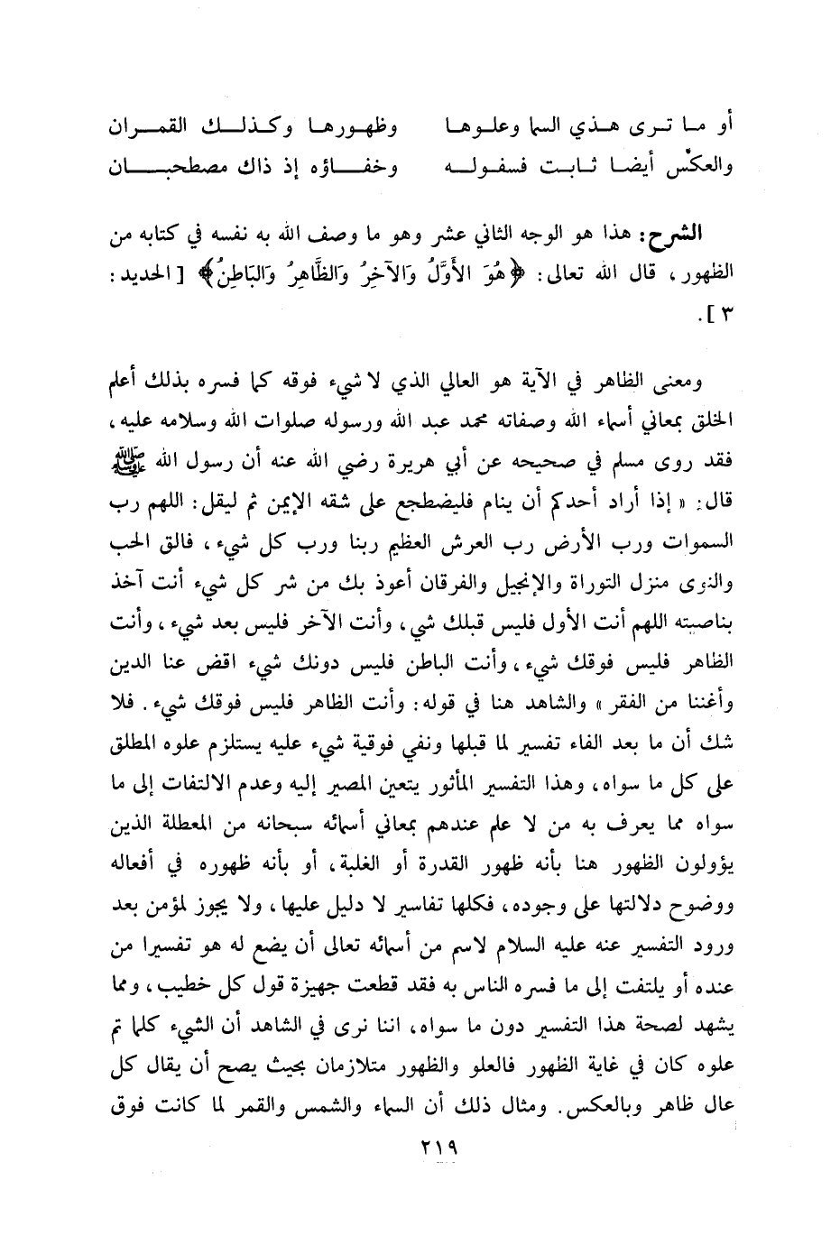 و معنى الظاهر في الآية هو العالي الذي لا شي ء فوقه كما فسره بذلك أعلم الخلق بمعاني أسماء اللّه وصفاته محمد عبد اللّه ورسوله صلوات اللّه وسلامه عليه، فقد روى مسلم في صحيحه عن أبي هريرة رضي اللّه عنه أن رسول اللّه صلّى اللّه عليه وسلّم قال: «إذا أراد أحدكم أن ينام فليضطجع على شقه الأيمن ثم ليقل: اللهم رب السموات ورب الأرض رب العرش العظيم ربنا ورب كل شي ء، فالق الحب والنوى منزل التوراة والإنجيل والفرقان أعوذ بك من شر كل شي ء أنت آخذ بناصيته اللهم أنت الأول فليس قبلك شي ء، وأنت الآخر فليس بعد شي ء، وأنت الظاهر فليس فوقك شي ء، وأنت الباطن فليس دونك شي ء اقض عنا الدين وأغننا من الفقر» والشاهد هنا في قوله: وأنت الظاهر فليس فوقك شي ء. فلا شك أن ما بعد الفاء تفسير لما قبلها ونفي فوقية شي ء عليه يستلزم علوه المطلق على كل ما سواه، وهذا التفسير المأثور يتعين المصير إليه وعدم الالتفات إلى ما سواه مما يعرف به من لا علم عندهم بمعاني أسمائه سبحانه من المعطلة الذين يؤولون الظهور هنا بأنه ظهور القدرة أو الغلبة، أو بأنه ظهوره في أفعاله ووضوح دلالتها على وجوده، فكلها تفاسير لا دليل عليها، ولا يجوز لمؤمن بعد ورود التفسير عنه عليه السلام لاسم من أسمائه تعالى أن يضع له هو تفسيرا من عنده أو يلتفت إلى ما فسره الناس به فقد قطعت جهيزة قول كل خطيب، ومما يشهد لصحة هذا التفسير دون ما سواه، اننا نرى في الشاهد أن الشي ء كلما تم علوه كان في غاية الظهور فالعلو والظهور متلازمان بحيث يصح أن يقال كل عال ظاهر وبالعكس. ومثال ذلك أن السماء والشمس والقمر لما كانت فوق