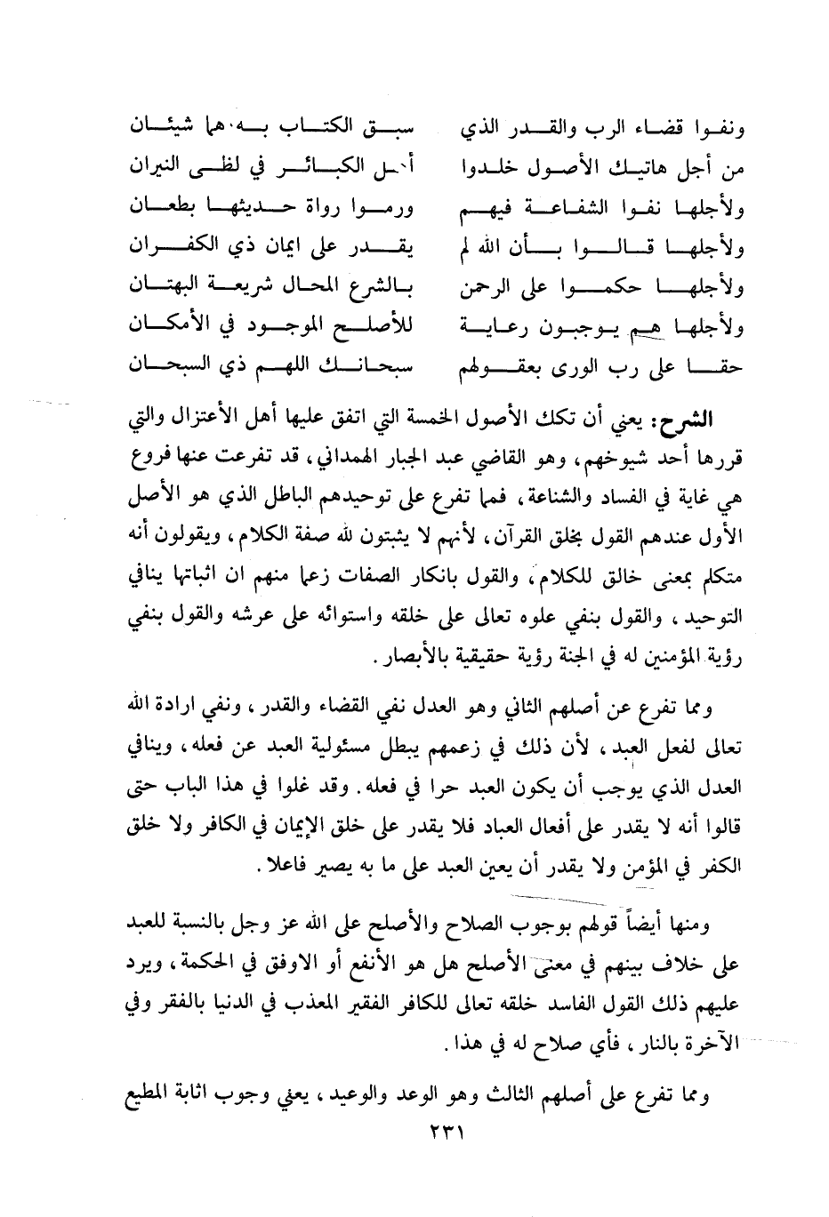 يعني أن تلك الأصول الخمسة التي اتفق عليها أهل الاعتزال والتي قررها أحد شيوخهم، وهو القاضي عبد الجبار الهمداني، قد تفرعت عنها فروع هي غاية في الفساد والشناعة، فمما تفرع على توحيدهم الباطل الذي هو الأصل الأول عندهم القول بخلق القرآن، لأنهم لا يثبتون للّه صفة الكلام، ويقولون أنه متكلم بمعنى خالق للكلام، والقول بانكار الصفات زعما منهم ان اثباتها ينافي التوحيد، والقول بنفي علوه تعالى على خلقه واستوائه على عرشه والقول بنفي رؤية المؤمنين له في الجنة رؤية حقيقية بالأبصار.