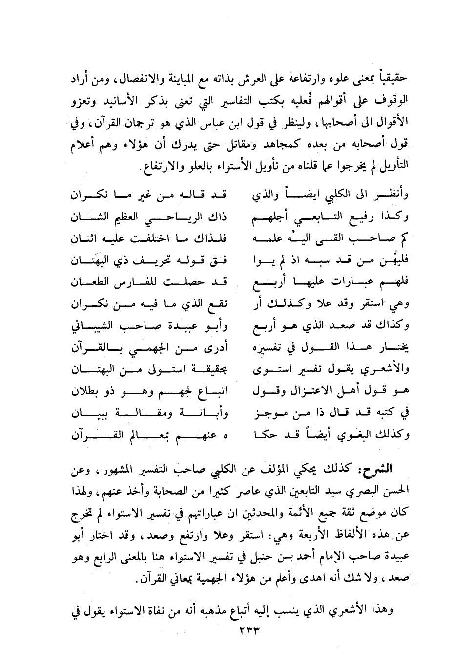 كذلك يحكي المؤلف عن الكلبي صاحب التفسير المشهور، وعن الحسن البصري سيد التابعين الذي عاصر كثيرا من الصحابة وأخذ عنهم، ولهذا كان موضع ثقة جميع الأئمة والمحدثين ان عباراتهم في تفسير الاستواء لم تخرج عن هذه الألفاظ الأربعة وهي: استقر وعلا وارتفع وصعد، وقد اختار أبو عبيدة صاحب الإمام أحمد بن حنبل في تفسير الاستواء هنا بالمعنى الرابع وهو صعد، ولا شك أنه اهدى وأعلم من هؤلاء الجهمية بمعاني القرآن.